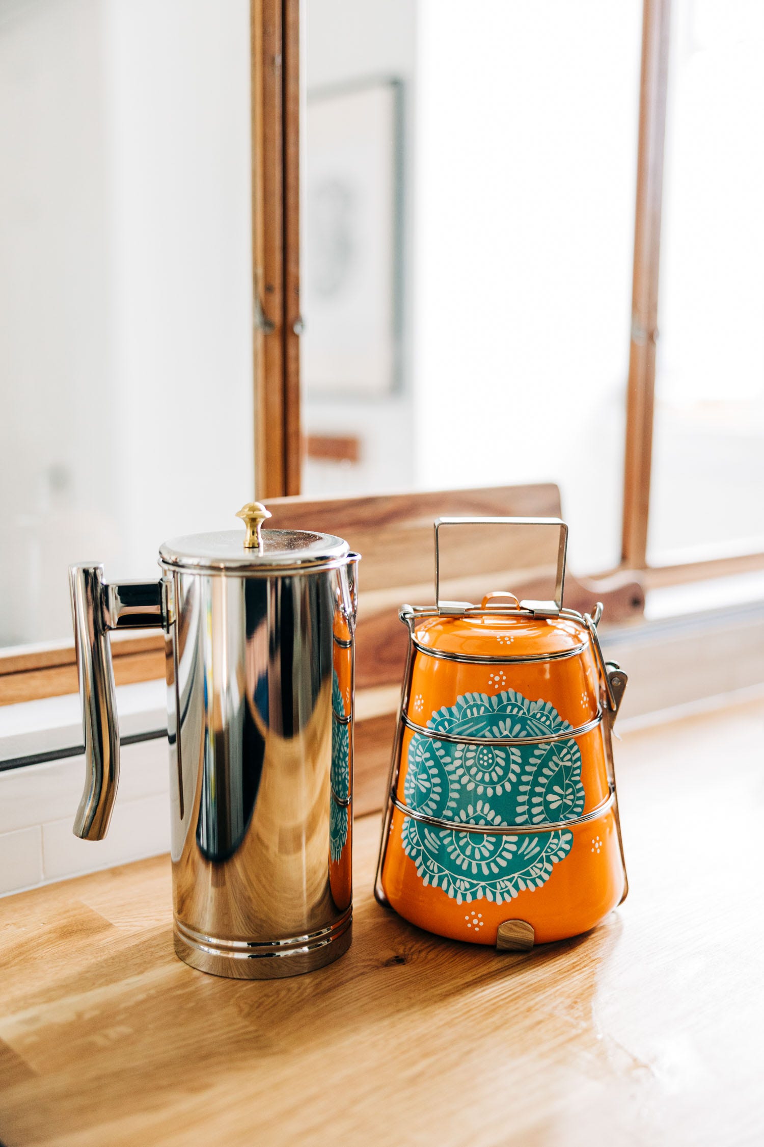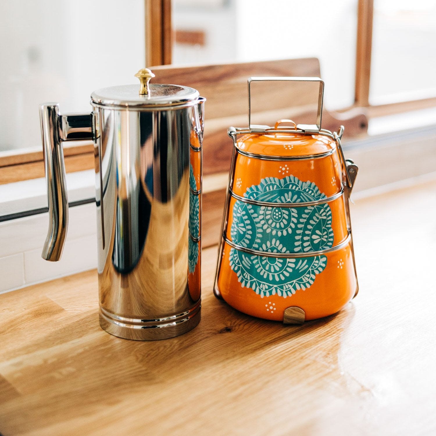 Going plastic-free at lunchtime is as easy as 1-2-3 with this 3 Tier Steel Tiffin To Go Container. Featuring 3 different stainless steel containers with lids that stack and connect, your lunch will stay put and you'll never buy another single-use plastic baggie again. This handcrafted container system is powder coated in orange with a handpainted blue and white design so your lunch is as stylish as it is eco-friendly. Bonus: the larger two lids can act as plates when mealtime arrives.