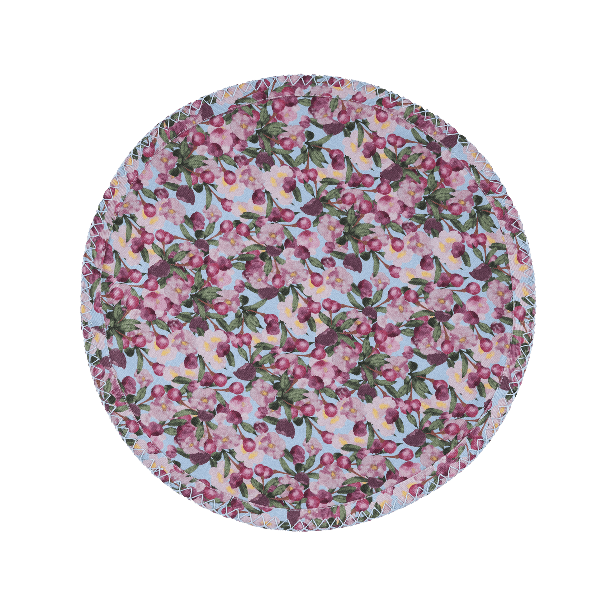 Round with an embroidered border in a heavy twill cotton. Pair them with their matching napkins or add a tablecloth for a full look.