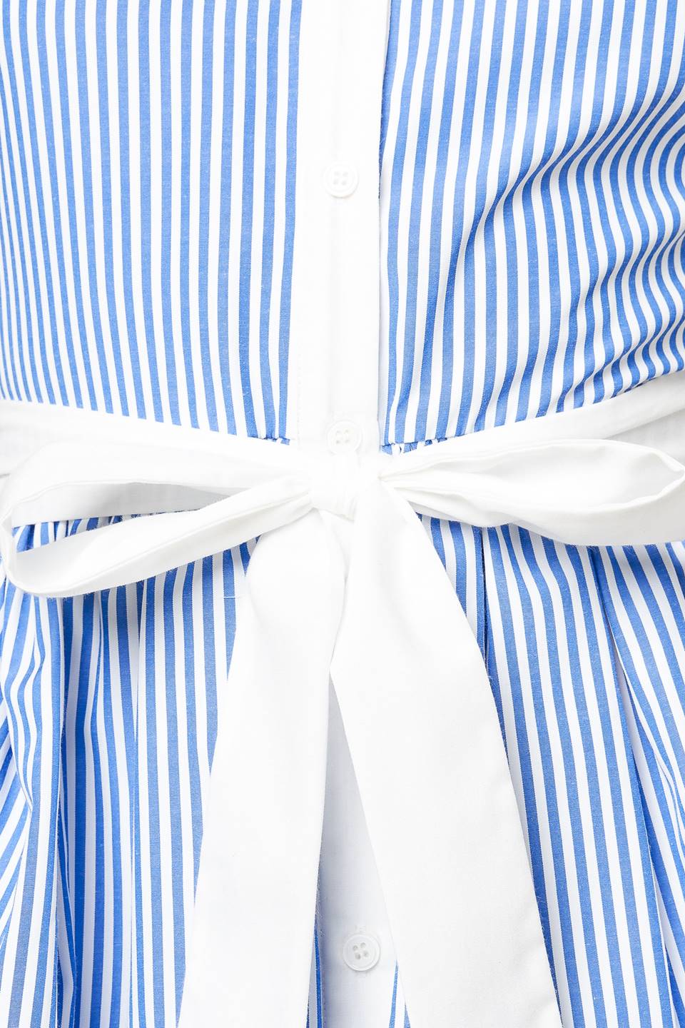 A striped woven midi dress featuring collar, button down, sleeveless, contrasting sash tie and layered skirt.