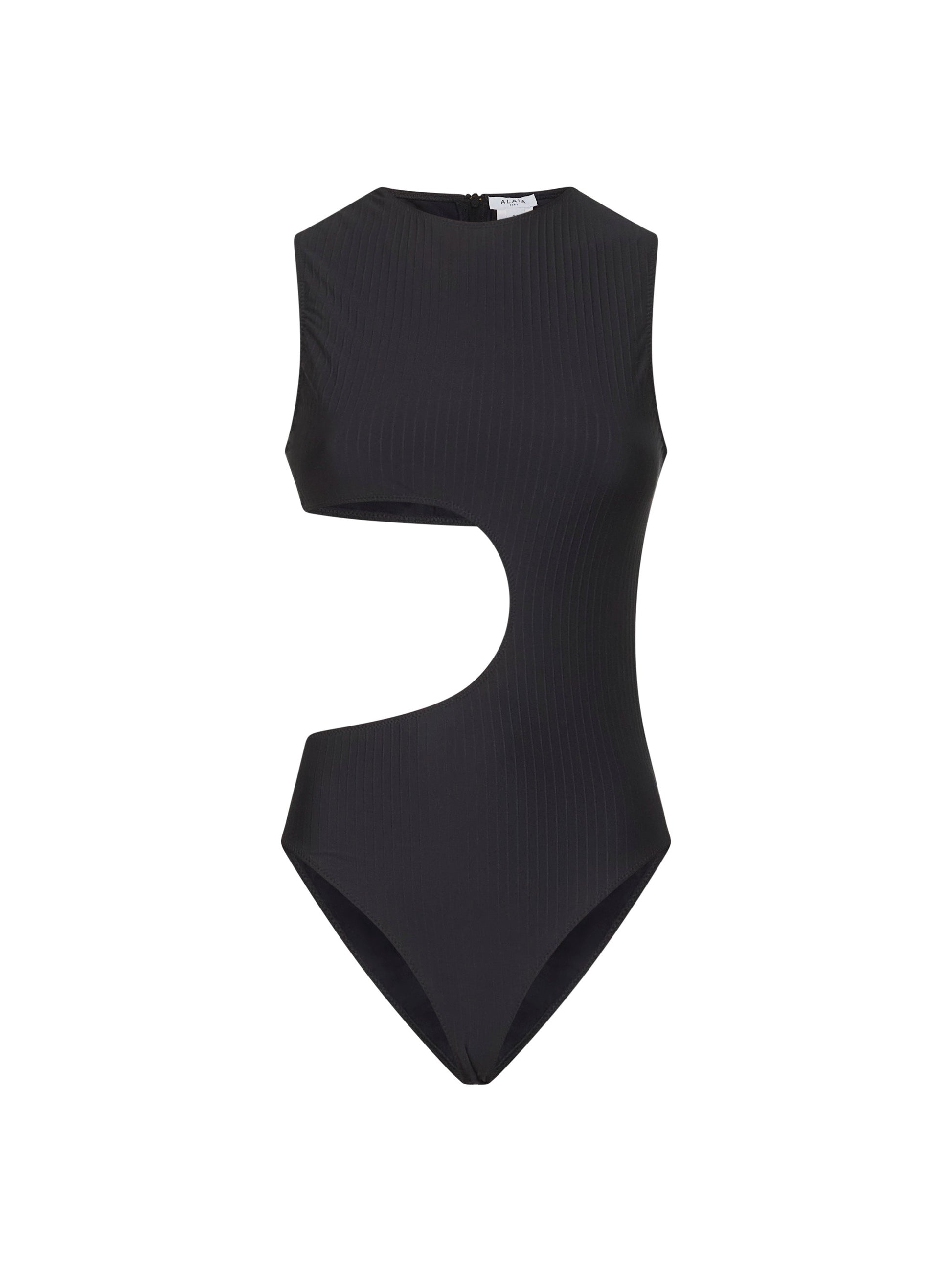 •Round neckline •Wide shoulder straps, sleeveless •Asymmetric side cut-out detail •Sculpting jersey design embossed with horizontal striped pattern •Lined •Black color •72% Polyamide, 28% Elastane •Made in Italy