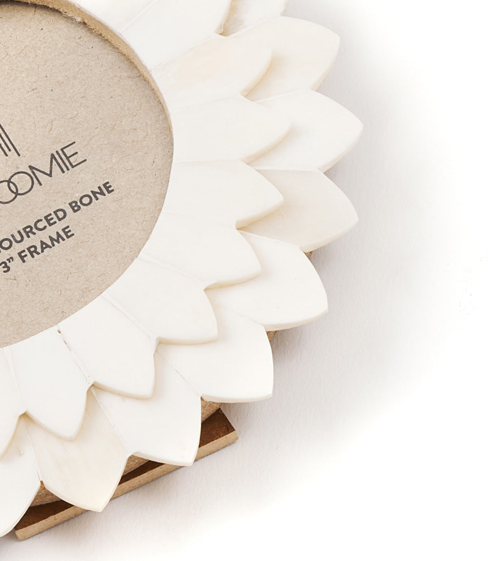Handcrafted round photo frame features ethically sourced bone in a hand carved, 3D bloom design with a two-way table top easel and two d-rings for hanging. The picture frame accommodates 3x3 photo or print, easily accessed with metal swivel tabs and removable back.