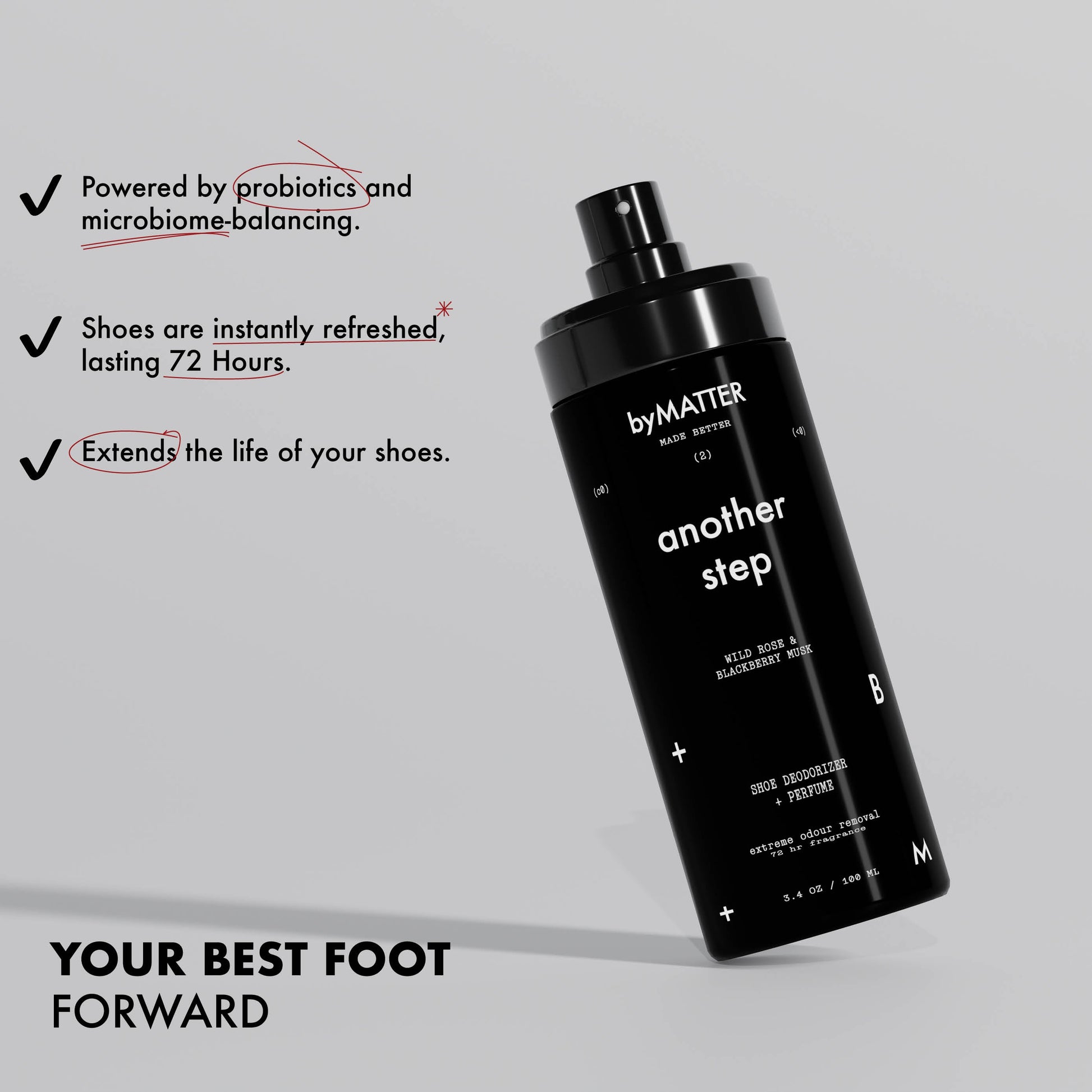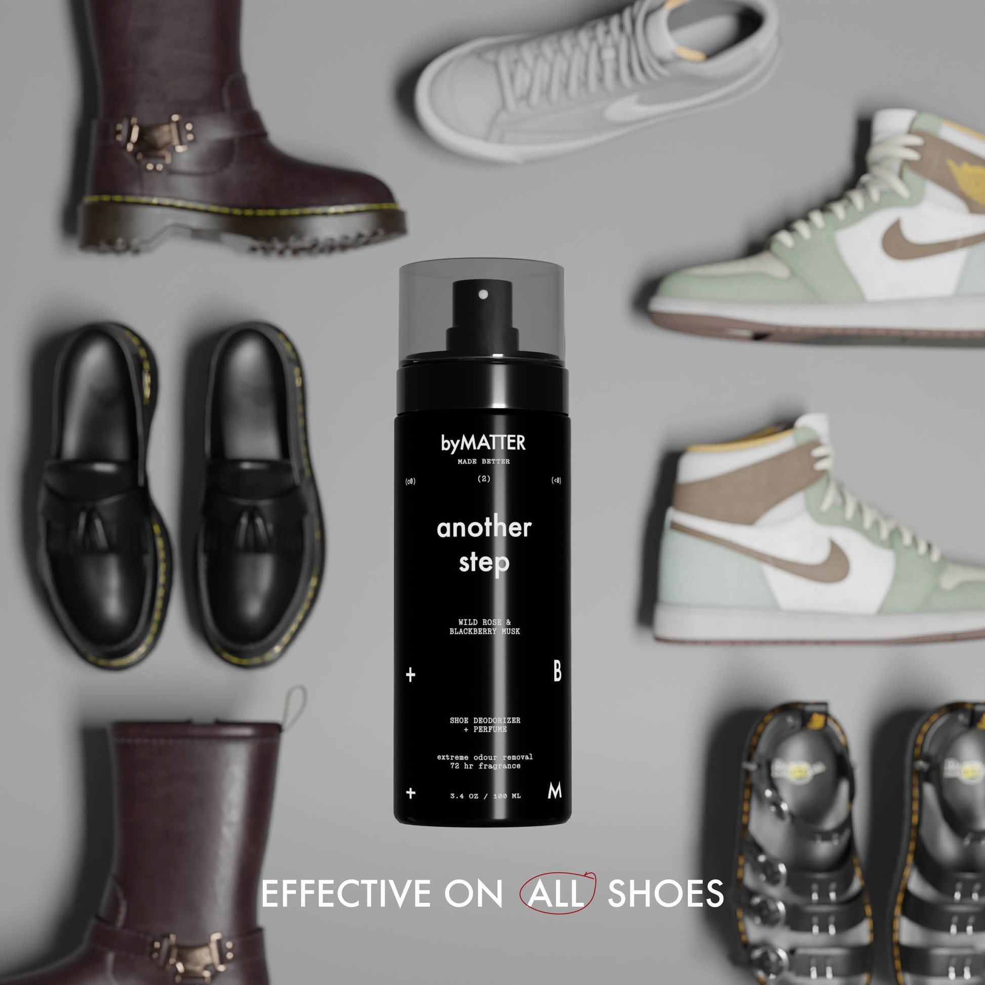 Another Step is our luxury shoe deodorizer and perfume — designed to neutralise odour and leave a lasting fragrance. Perfect for sneakers, boots, and everyday shoes, it refreshes your footwear in seconds without masking smells. Compact enough to keep by the door or slip into a bag, it’s an instant upgrade to your shoe care routine.