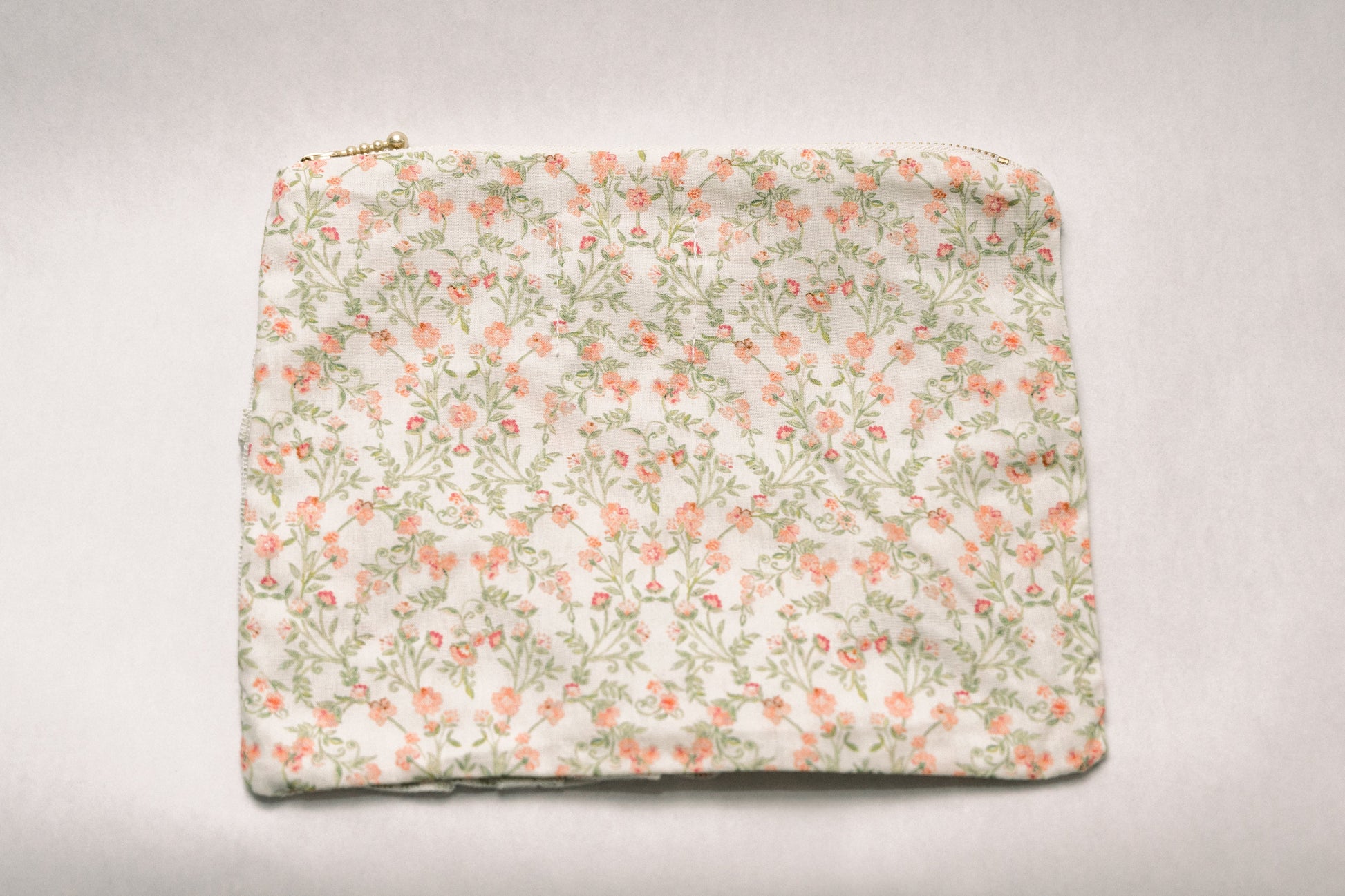 Apricot Meadow-Timeless charm meets everyday function in this sweet, vintage-inspired zippered pouch. Made from soft cotton fabric in a delicate apricot-and-green floral print, this pouch features romantic ruffle edging and a smooth brass zipper closure. Perfectly sized for keeping little treasures, pacifiers, hair bows, or mama essentials neatly tucked away. Whether you’re tossing it in your diaper bag or using it to store keepsakes, the Apricot Meadow pouch brings a soft touch of nostalgia and beauty to your day. Thoughtfully handcrafted with care, because even the smallest details should feel special. Dimensions: "9.06 × 7.09” Main Fabric: 100% Recycled Cotton Lining: 100% Recycled Cotton Looking for more floral styles? Explore the full Timeless Floral Ruffle Zipper Pouch Collection more than 20 unique prints, all made from recycled cotton with delicate ruffle details you’ll love.