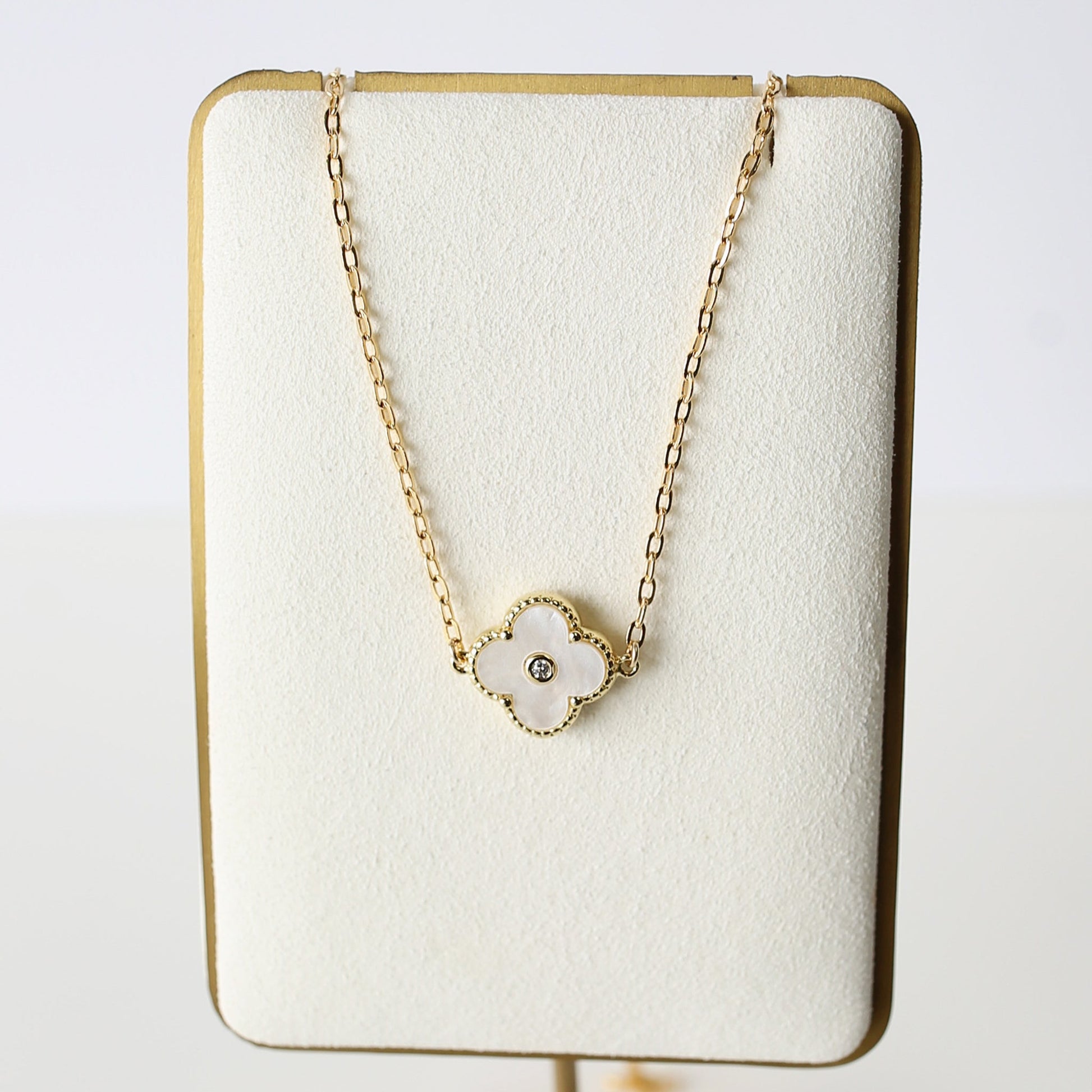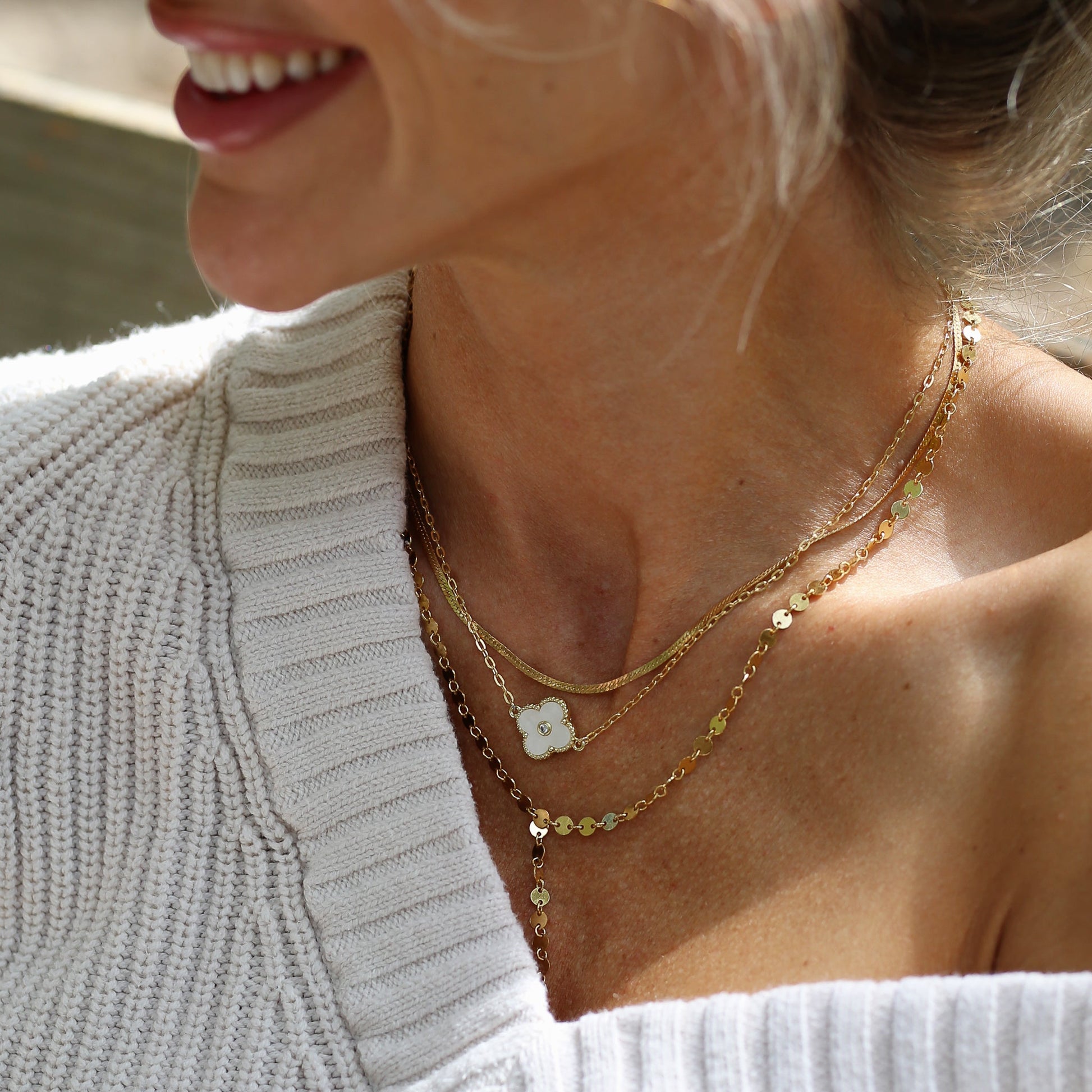 This delicate necklace showcases a dainty 14k gold chain, exuding subtle sophistication. At its center, a 14mm mother-of-pearl connector catches the light with a soft, radiant glow, adding a timeless touch. Designed with adjustable sizing for the perfect fit, this versatile piece can be worn alone or layered with others. Whether for everyday wear or a special occasion, it brings a sense of effortless elegance to any outfit.
