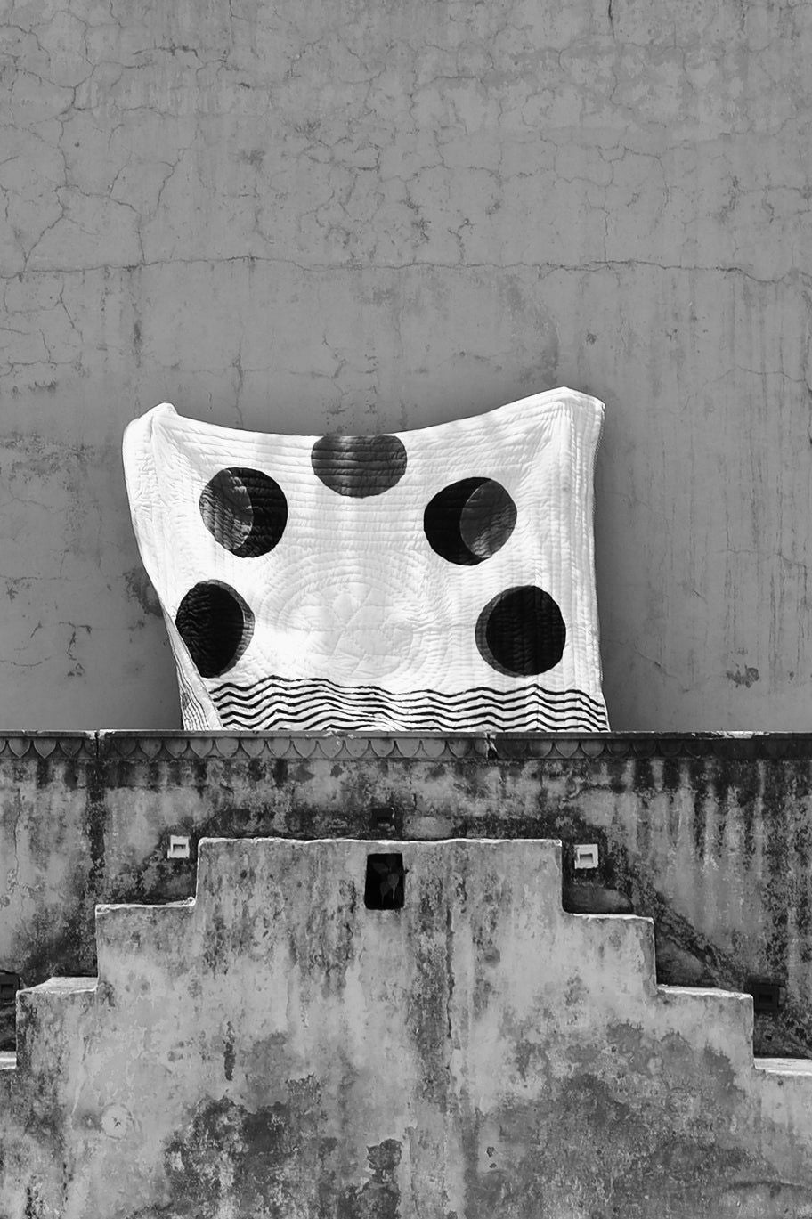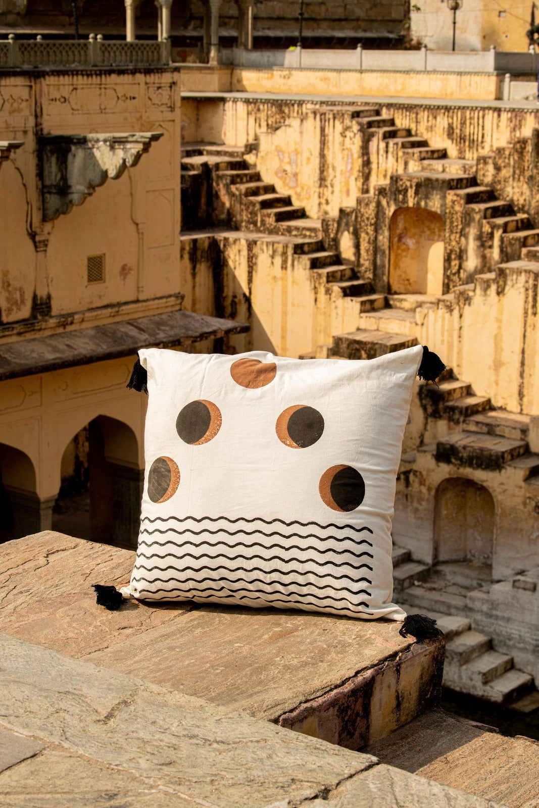 This reversible, hand-printed quilt on a crisp white base presents a modern take on lunar motifs. One side showcases a prominent brown moon, while the flip side features the lunar cycle in shades of black and brown. Each quilt is handmade from 100% cotton and requires attention from four artisans, including wood carvers, block printers, quiltmakers, and dye specialists. The design is hand-pressed onto each quilt using hand-carved wooden blocks dipped in dyes. The printed cotton shells are brought to the homes of quiltmakers, who stuff and stitch the quilts by hand, creating the final product. Our quilts are made in small batches. Due to the handcrafted nature of this item, expect slight variations in the appearance of each unique piece. - 100% cotton voile exterior - 100% cotton stuffing - Made in India - Ships from California - Queen size: 96″ x 96″ - King size: 108″ x 108″ - Sham size: 26″ x 26″