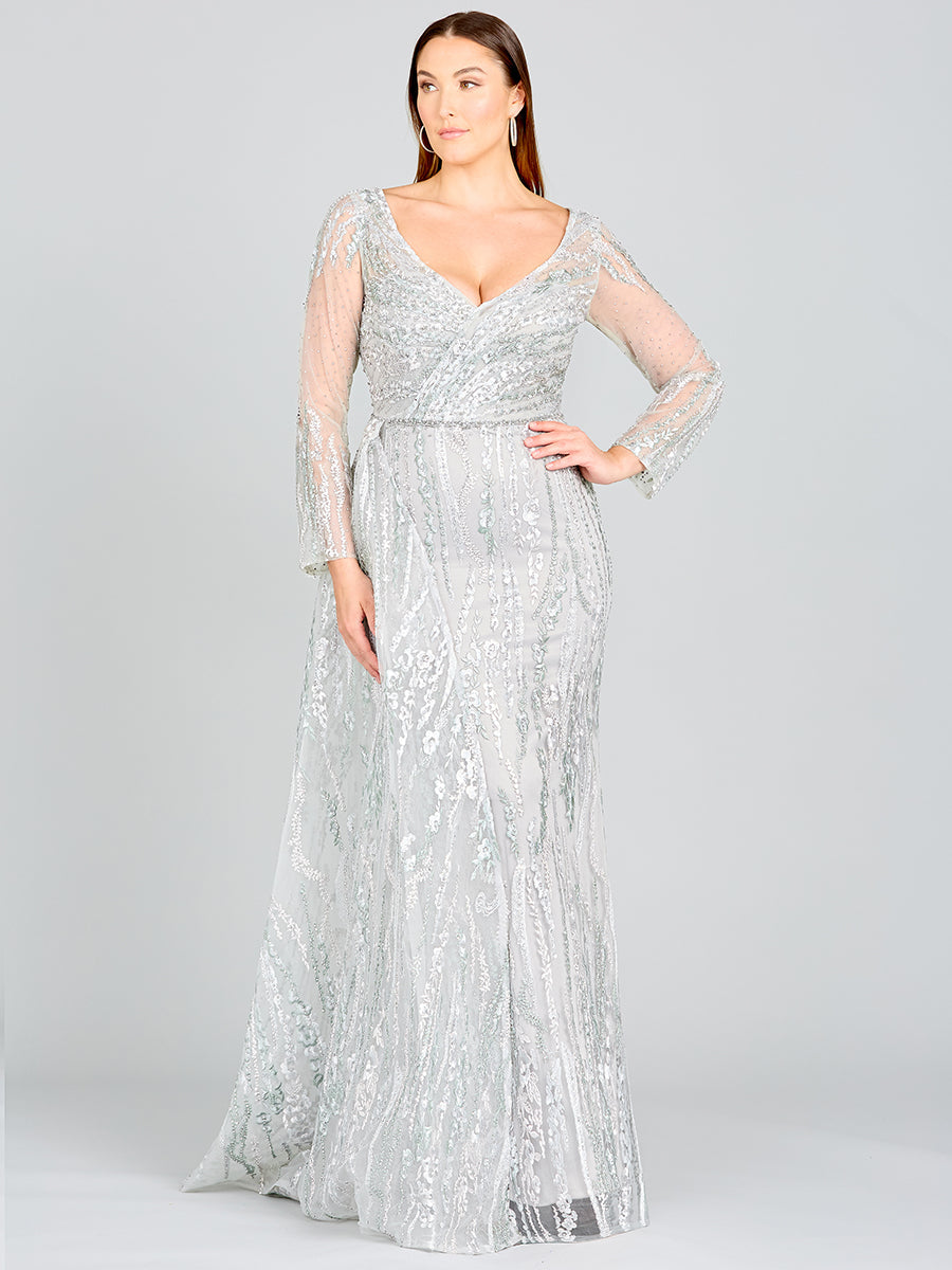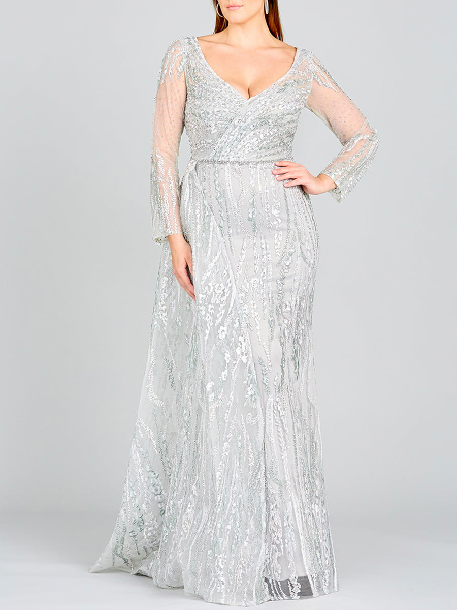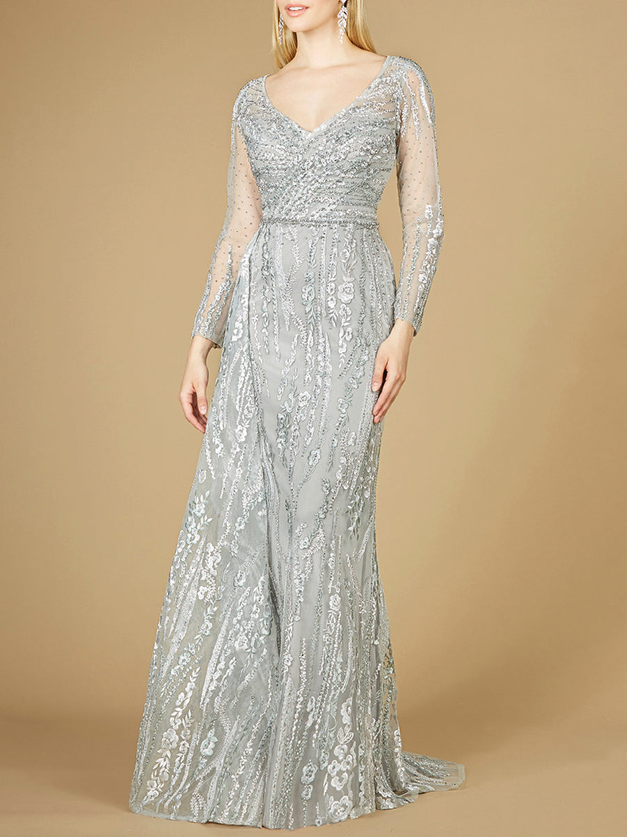Full length lace dress with long sleeves, v neck dress embellished with rhinestones, lace appliques. It features a skirt overlay. Perfect to wear to your daughter's wedding or engagement party.