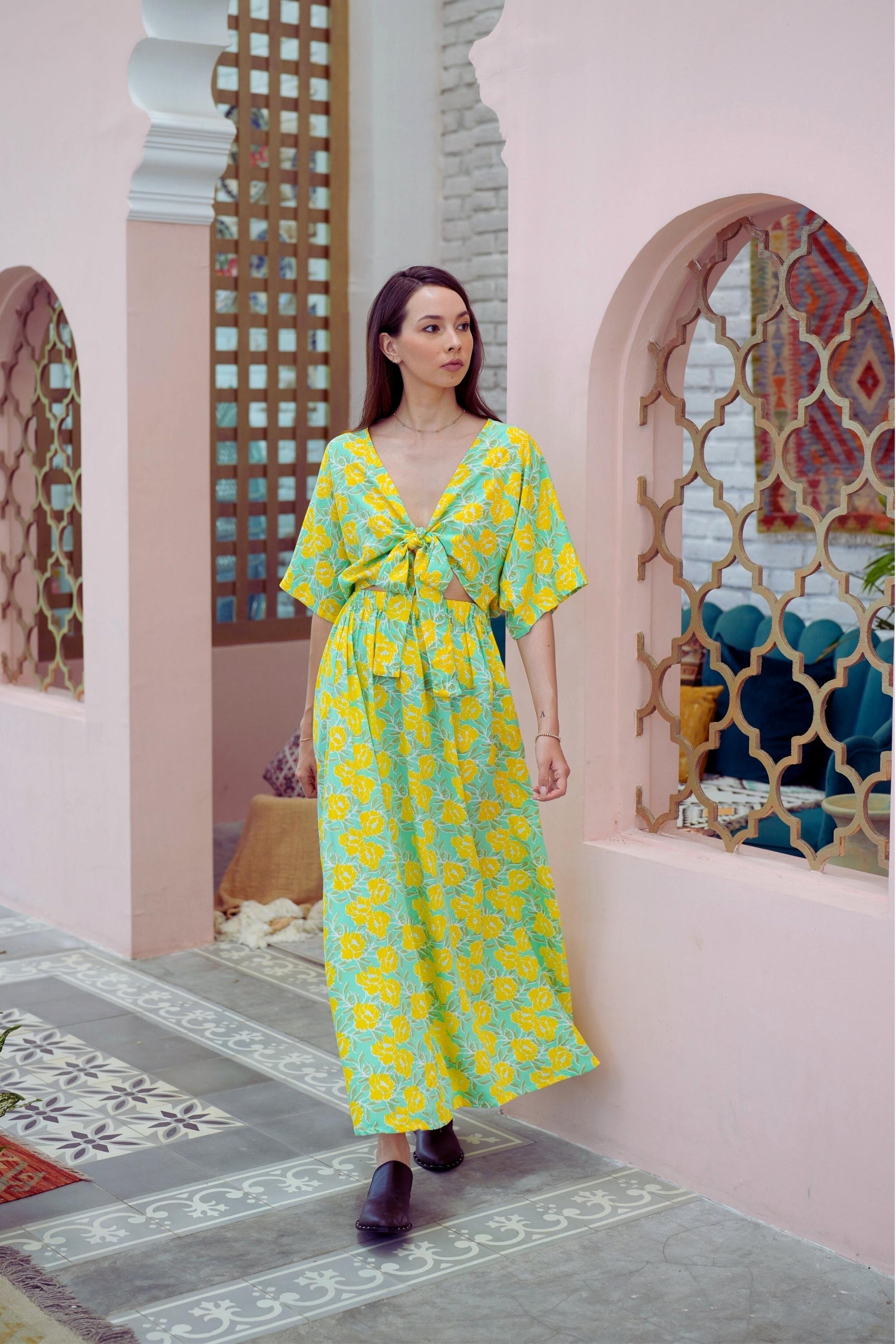 A wrap top that flattering all body types with bows can be tie at the front, side or back to create various looks instantly as an everyday top. Perfect to pair with our matching skirt for a weekend date outfits. Wear over your bathing suit as a cover-up. Our model is 5'7" is wearing skirt size S/M and wrap top one size. Material: Rayon Yellow Garden. Wrap Top is One Size (Fit S to L). Skirt is S/M Skirt S/M Measurements: length: 35.5” (90 cm). Elastic waistband. Shipping & Returns: No Return accepted. Please see our Shipping & Returns page for more details.