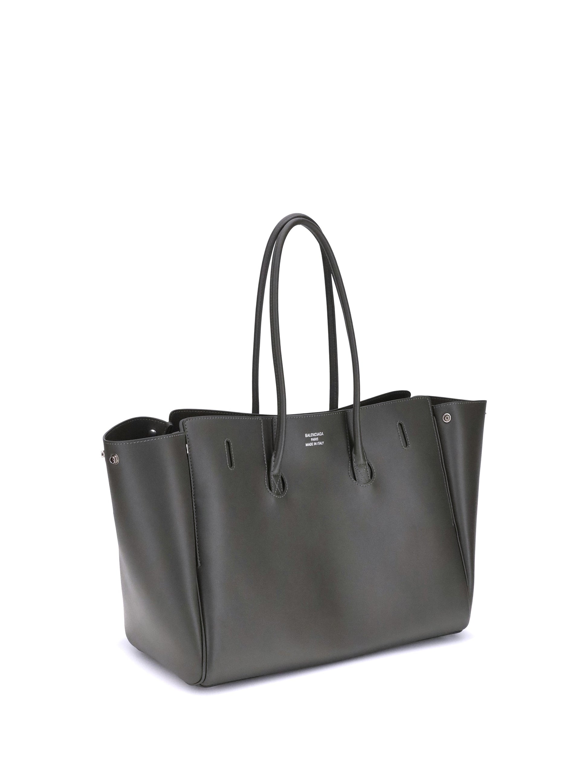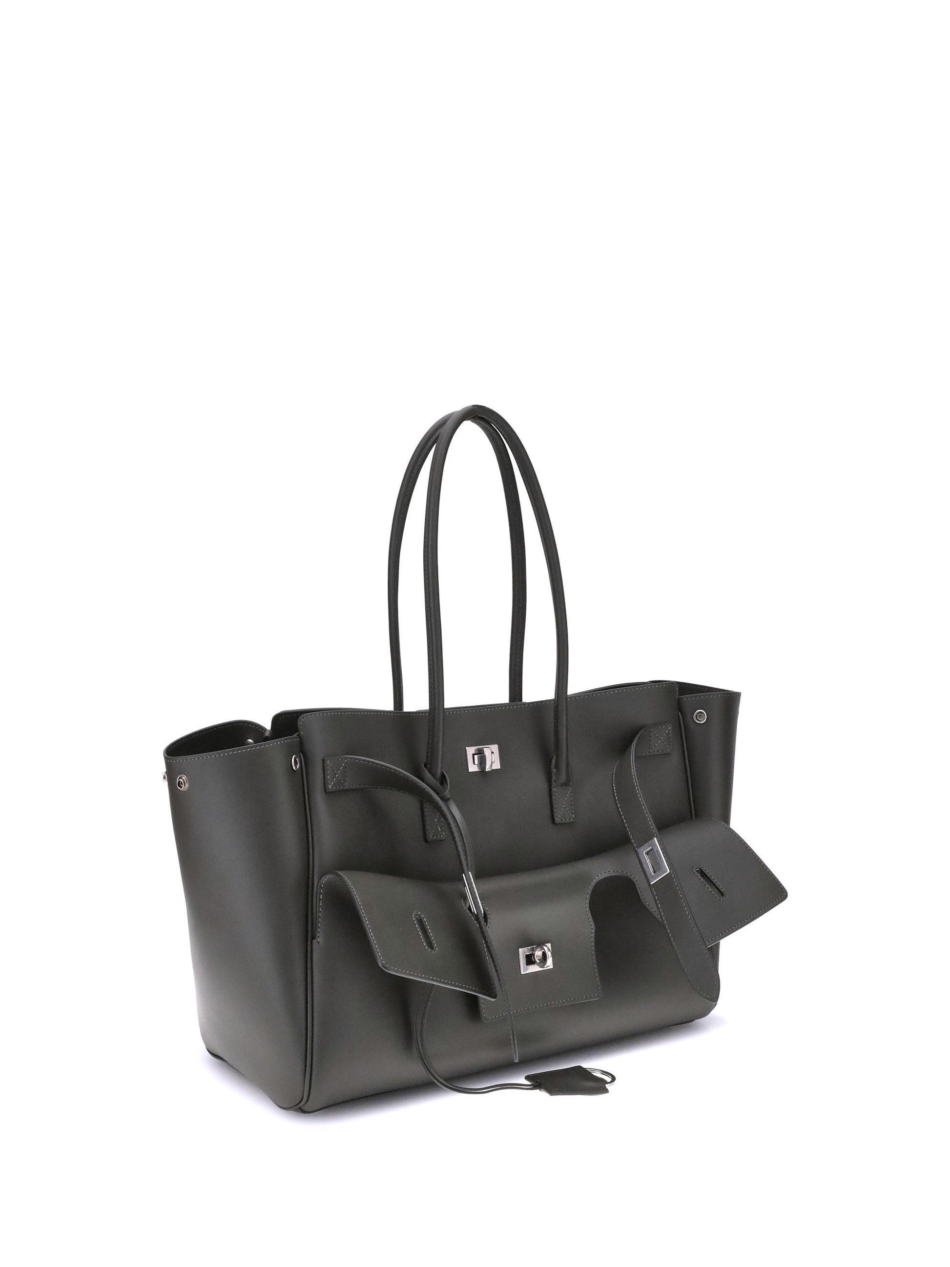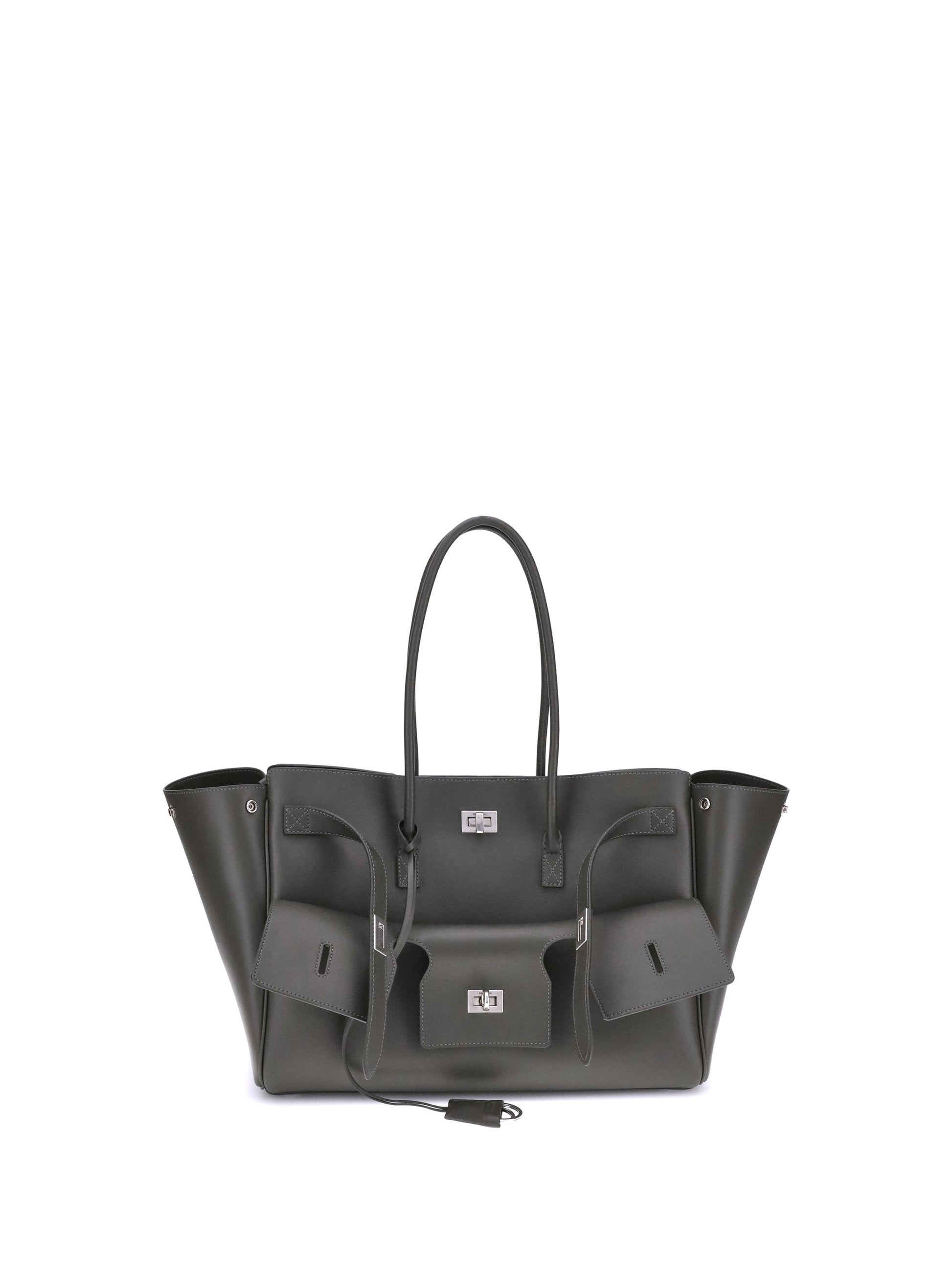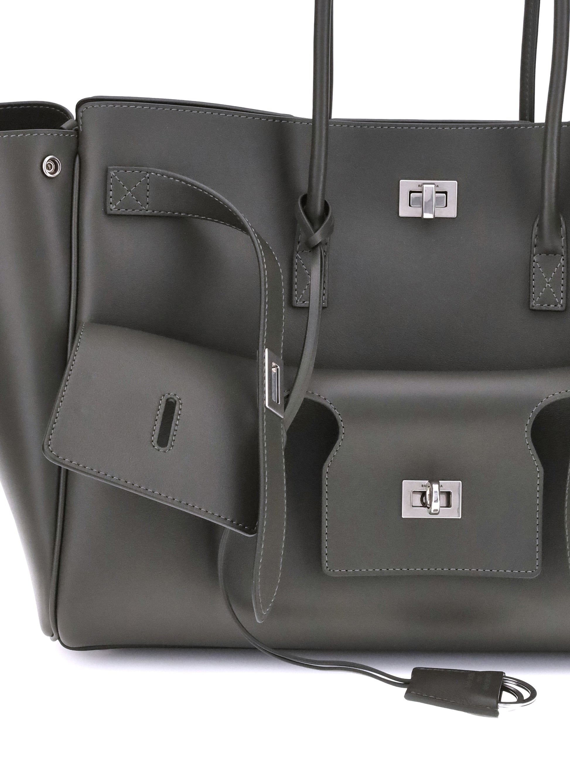 Balenciaga's Bel Air medium Shoulder Bag is a spacious and functional accessory with a versatile pouch design. It features two handles for convenient carrying and the Balenciaga Paris logo embossed with silver lamination on the back, attesting to its authenticity. Enhanced with silver hardware and a removable key ring with double spiral loop, this bag is designed for organization: it includes snap buttons on the sides to modulate the shape, a swivel closure, and belts on the front with engraved logo. The interior features a large front pocket, an open main compartment, two interior zippered pockets and two interior flat pockets, offering practical solutions for every need.
