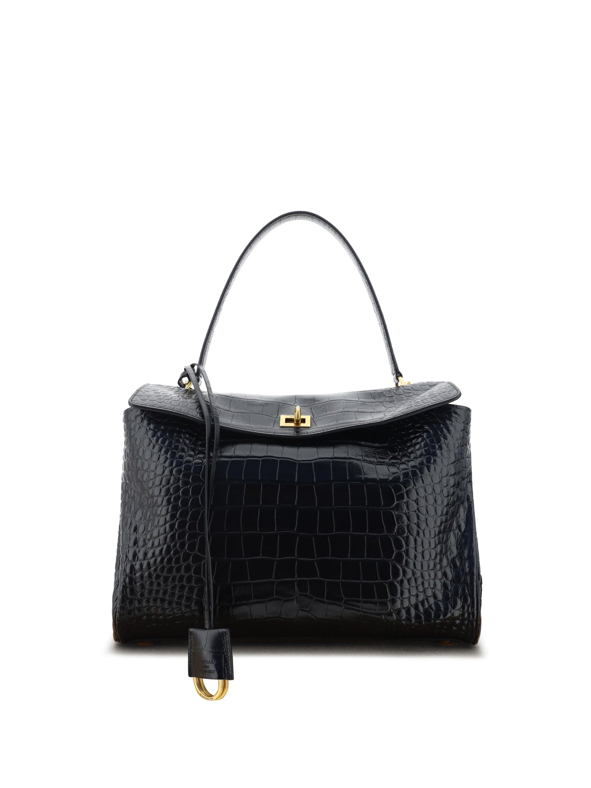 Leather Medium Rodeo Handbag by Balenciaga, single removable top handle, charm with key ring detail applied at base of handle, dual compartment, flap closure with swivel system at front, crocodile-effect leather design, double welt pocket on back panel.