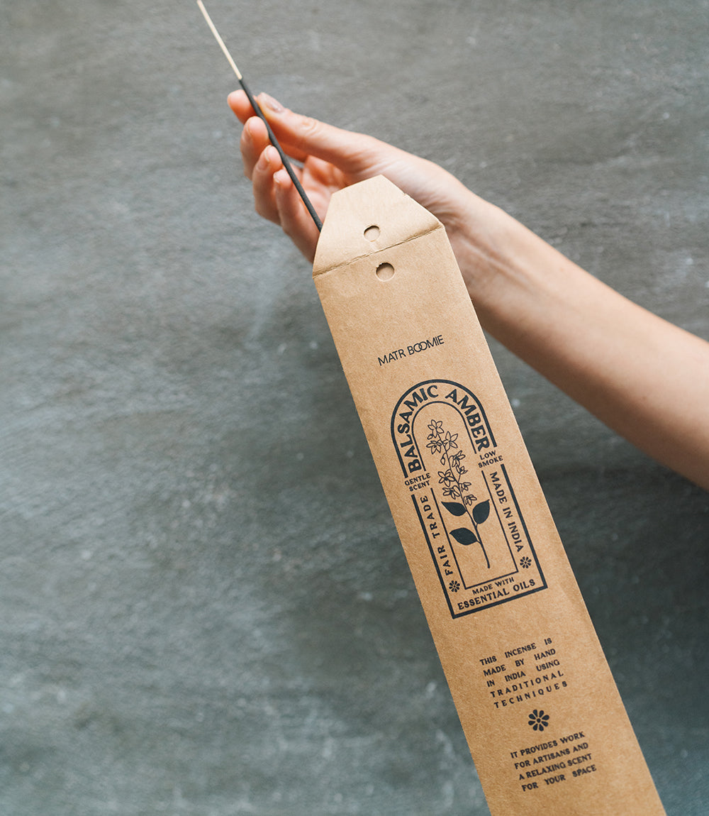 Made using natural materials, our exclusive incense collection is handcrafted by artisans in India using traditional techniques. These low-smoke incense sticks are made with essential oils, are free from artificial dyes, and come in packaging featuring hand drawn illustrations of the types of botanicals used. Balsamic Amber is a grounding combination of sweet, woodsy balsamic and warm, energizing amber and makes a great gender-neutral gift. Each pack includes 10 sticks.