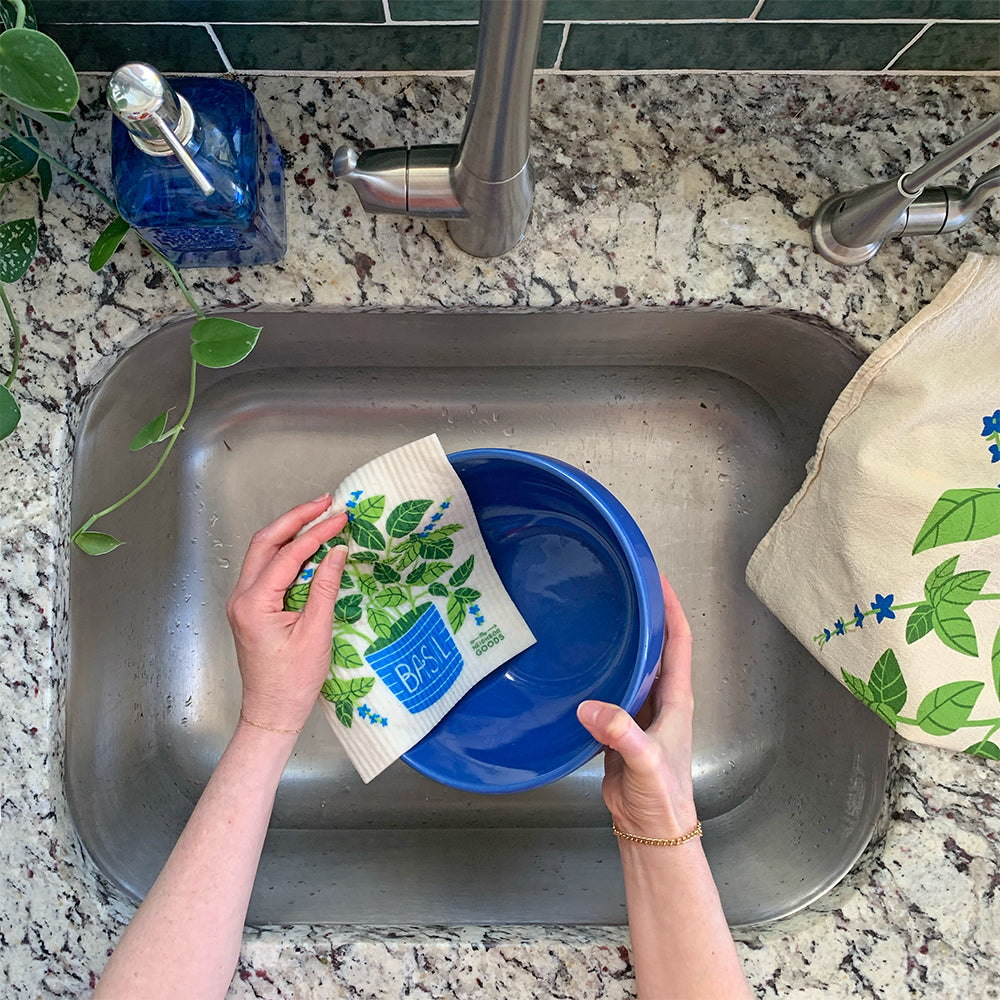These cloths are an eco-friendly replacement for kitchen sponges and paper towels, making cleaning up cute with less waste. You can use them for so many tasks such as: - washing dishes - wiping up spills - washing windows and mirrors - dusting furniture - washing your car - and MORE! WE ADDED A HOLE SO YOU CAN EASILY HANG THEM TO DRY: They can hold up to 15x their weight in water and dry quickly. EASY TO CLEAN: You don’t have to wash after every use, just a rinse under water is fine, but every now and then you can pop them in the dish washer (top rack), washing machine, or boil in hot water to clean BIODEGRADABLE + COMPOSTABLE: Will last for several months and when you’re done they biodegrade in the garbage or better yet you can throw them in your compost bin. • Measures 6.8" x 7.75" • Designed + packaged in the USA, manufactured and printed in Sweden using eco-friendly water-based inks Love our basil design and are looking for more? Check out our matching dish towel! Color may vary slightly from your monitor to actual coloring.