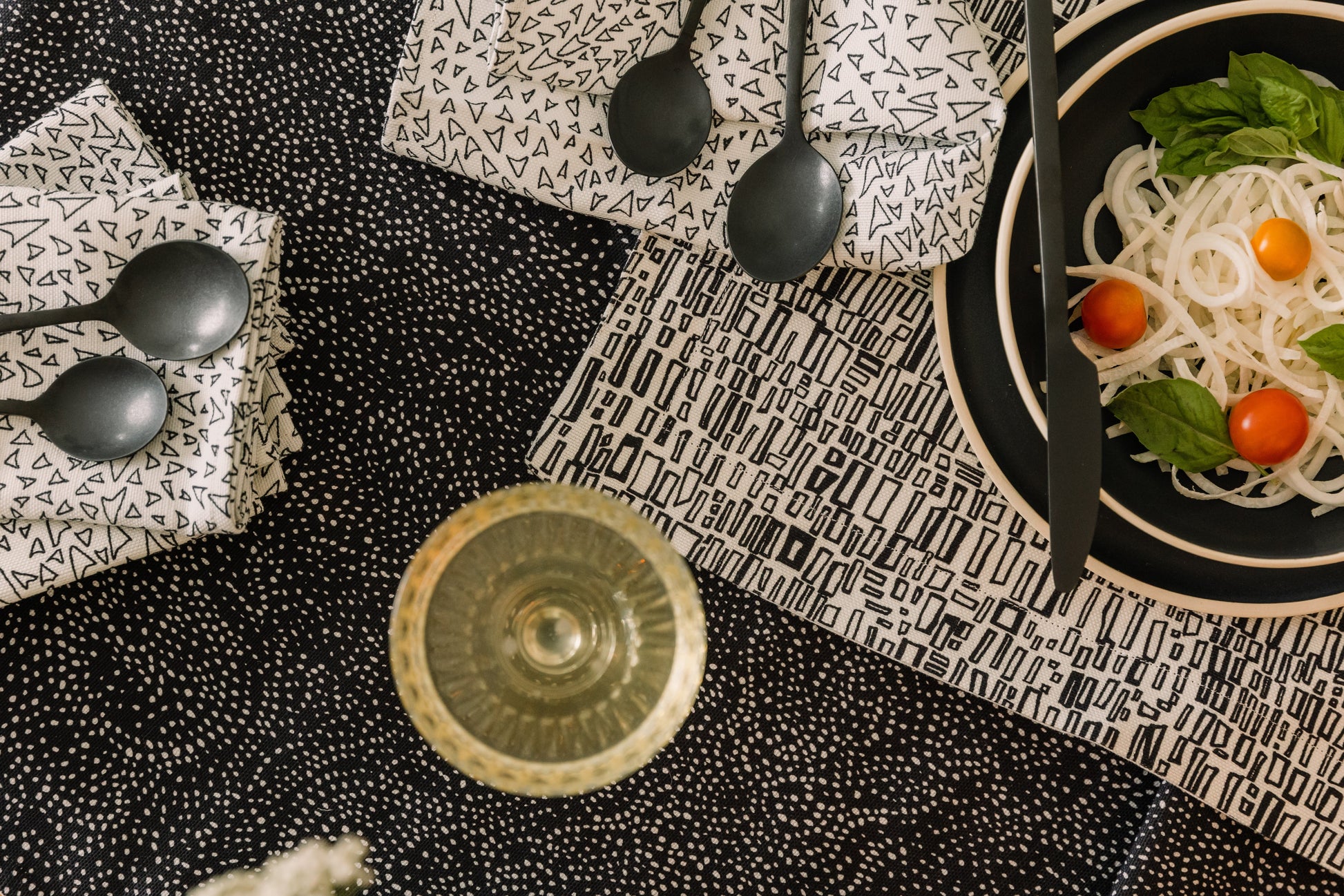 The Basilone Napkin in Albatross is responsibly printed, cut and sewn in the US on a 55% linen and 45% cotton blend with yarns from Belgium. It measures approximately 18” x 18”.