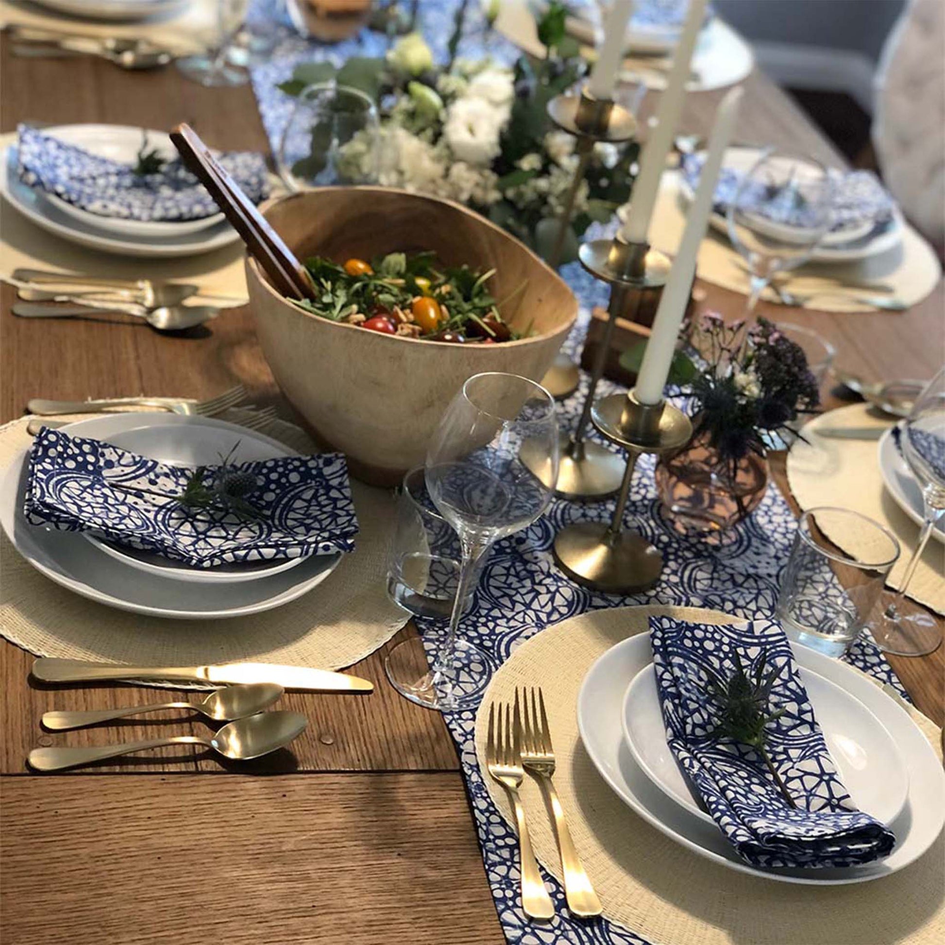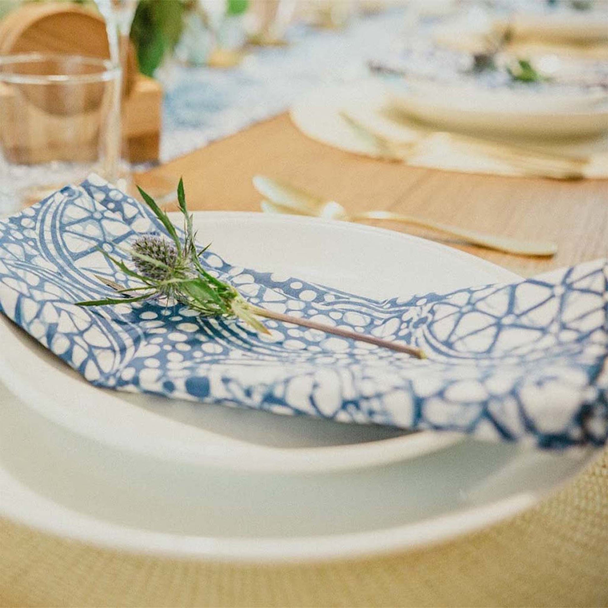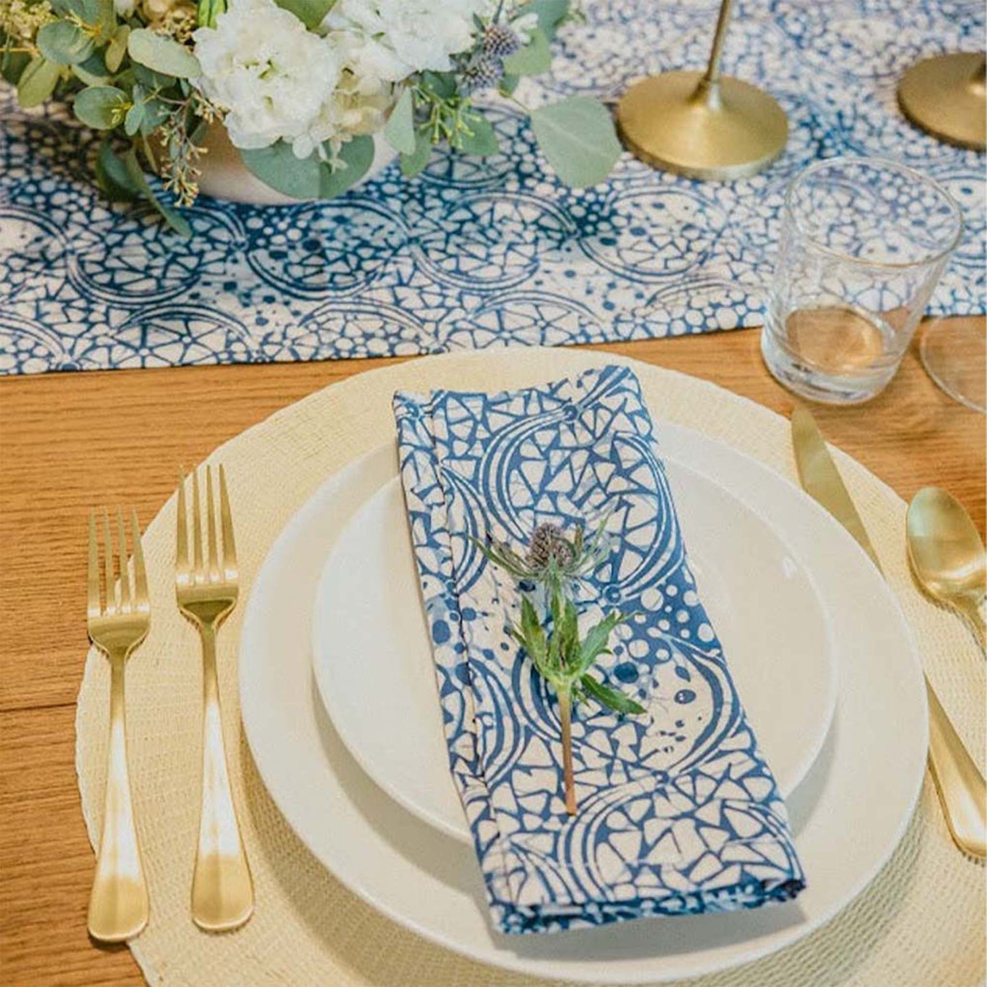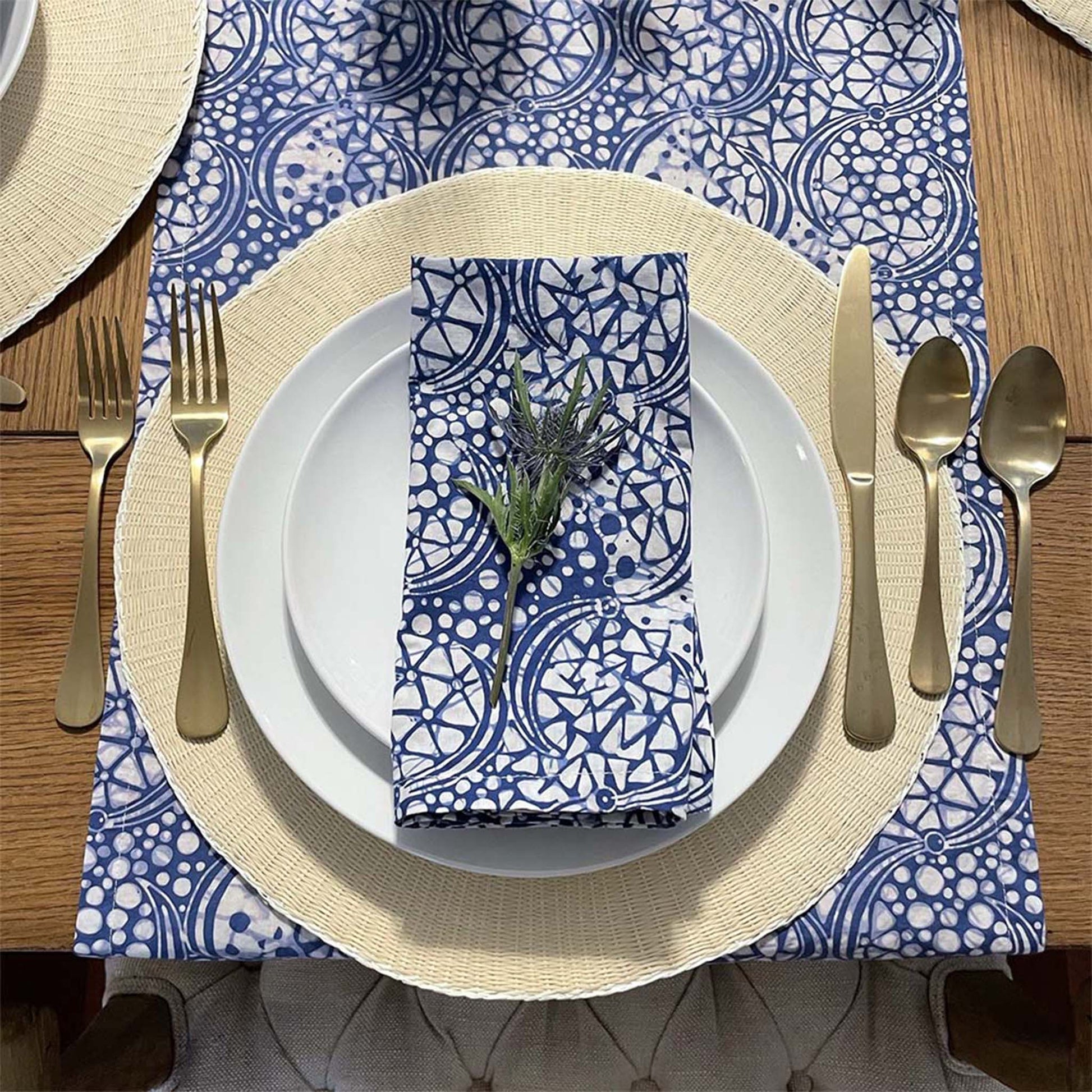 batik table linen, batik table cloth, batik tablescape, modern batik, handmade batik linen, handpainted batik fabric, washable, reusable batik napkin, boho tablescape, bohemian tablesetting, blue cotton batik fabric, handblock print, hand block print, handstamped batik, batik cap, copper block batik print, ecofriendly gift, ecofriendly napkin, sustainable gift, fair trade gift, artisan made, hostess gift, hostess with the mosess gift idea, house warming gift, welcome gifts, blue indigo, blue indigo napkin, light blue napkin