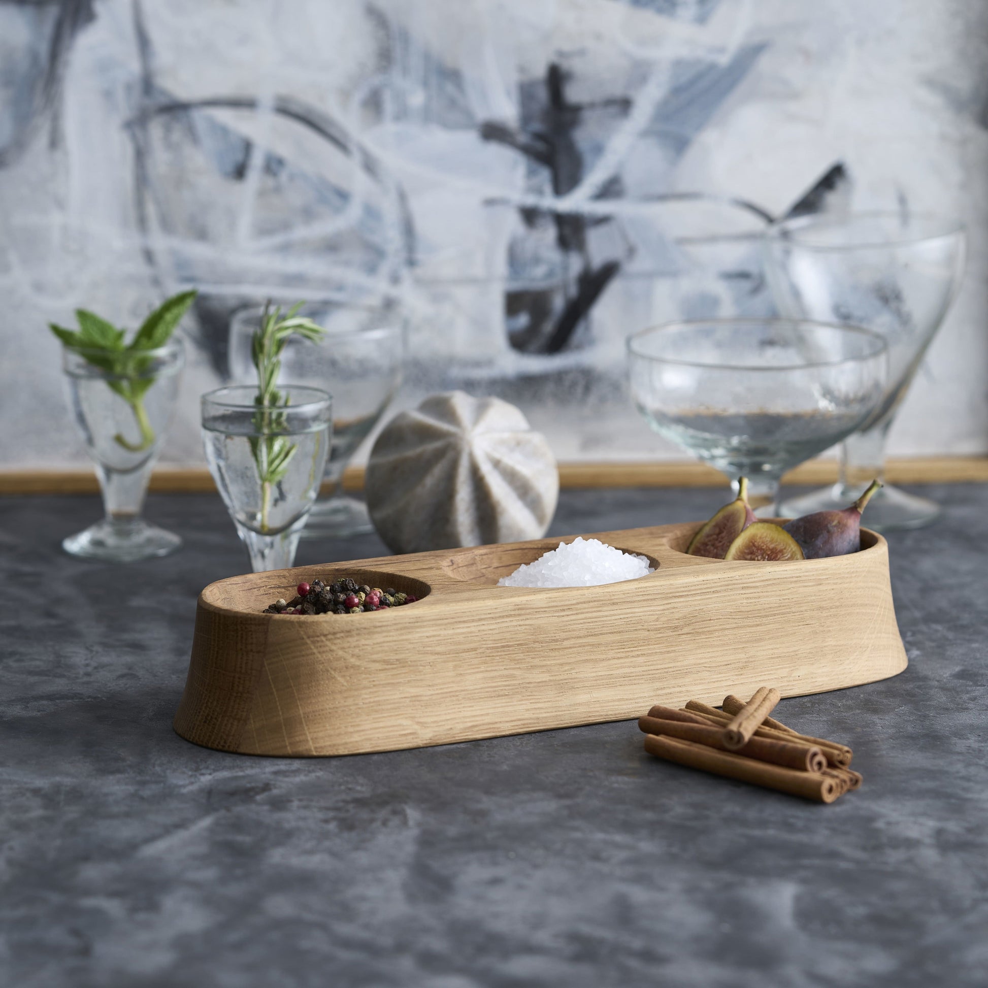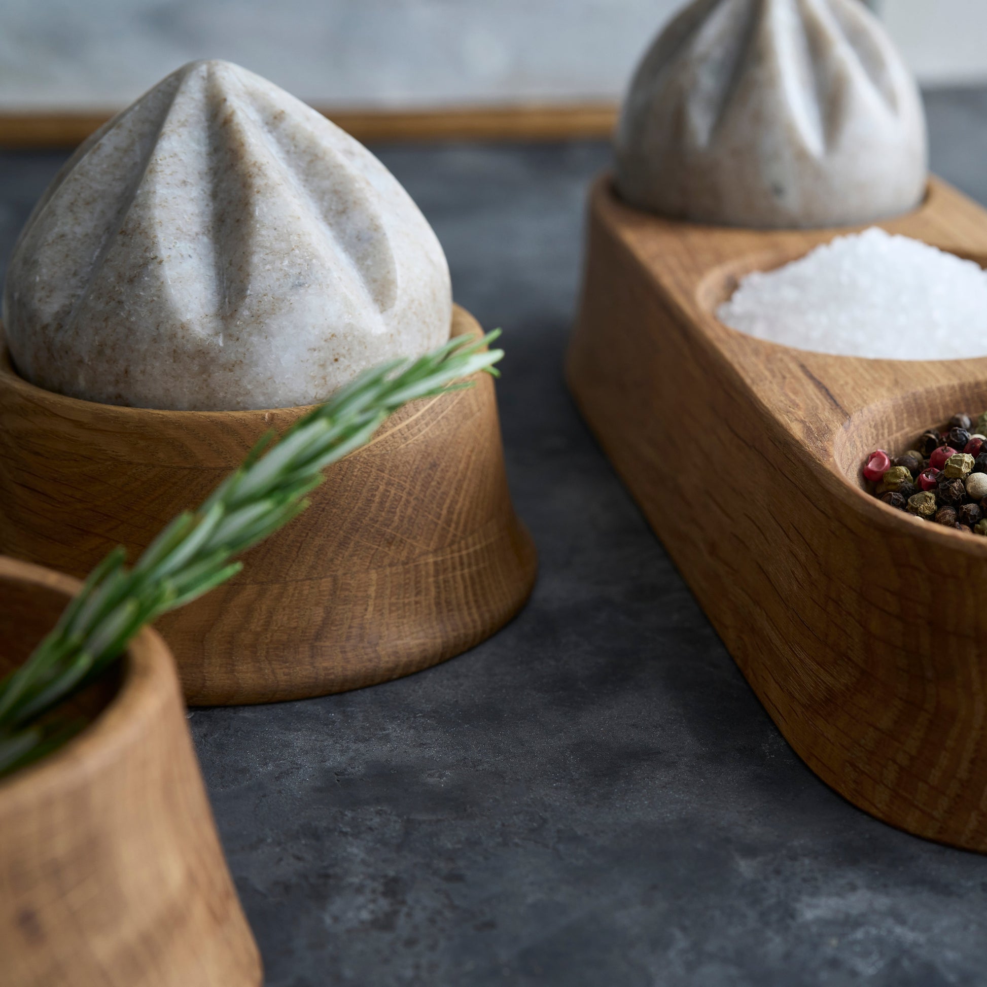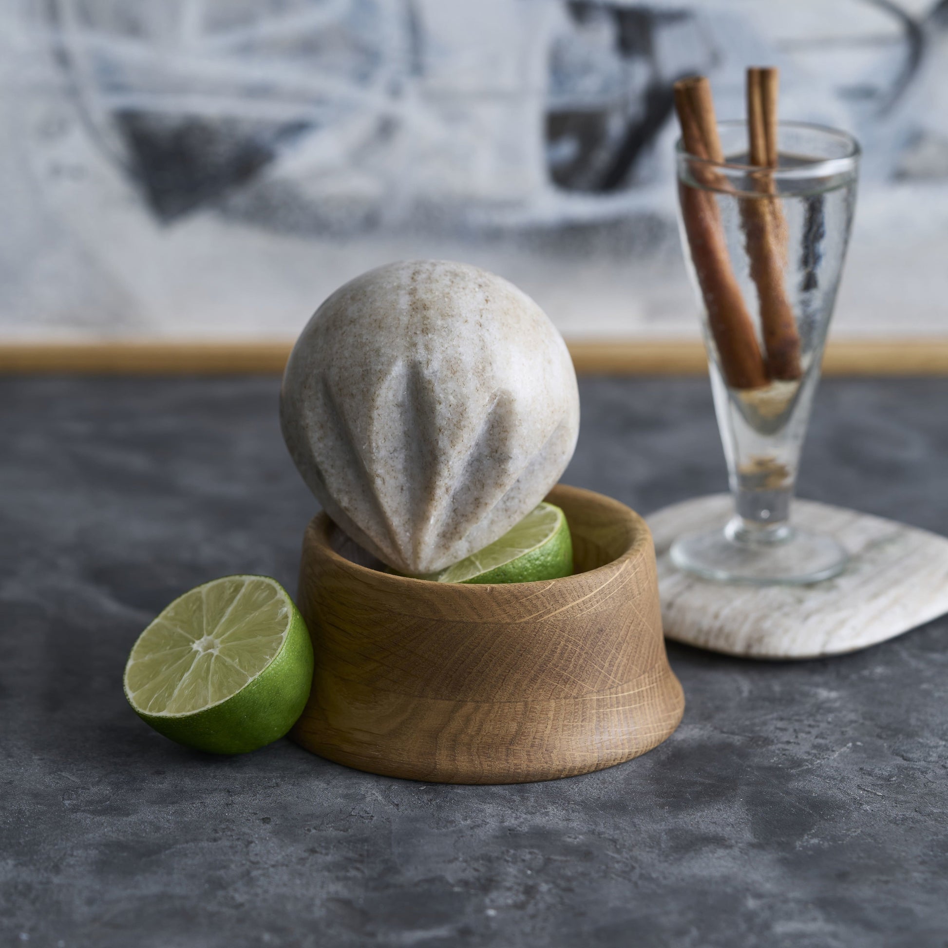 Sculpted from imported oak and paired with a hand-carved marble reamer, this set brings refined simplicity to everyday prep. The rounded tray holds the spherical reamer and, depending on the size, includes additional wells for herbs, spices, or cocktail garnishes. Perfect for adding a splash of fresh citrus while cooking or bartending, it also makes a thoughtful hostess gift when paired with gourmet salts or oils.