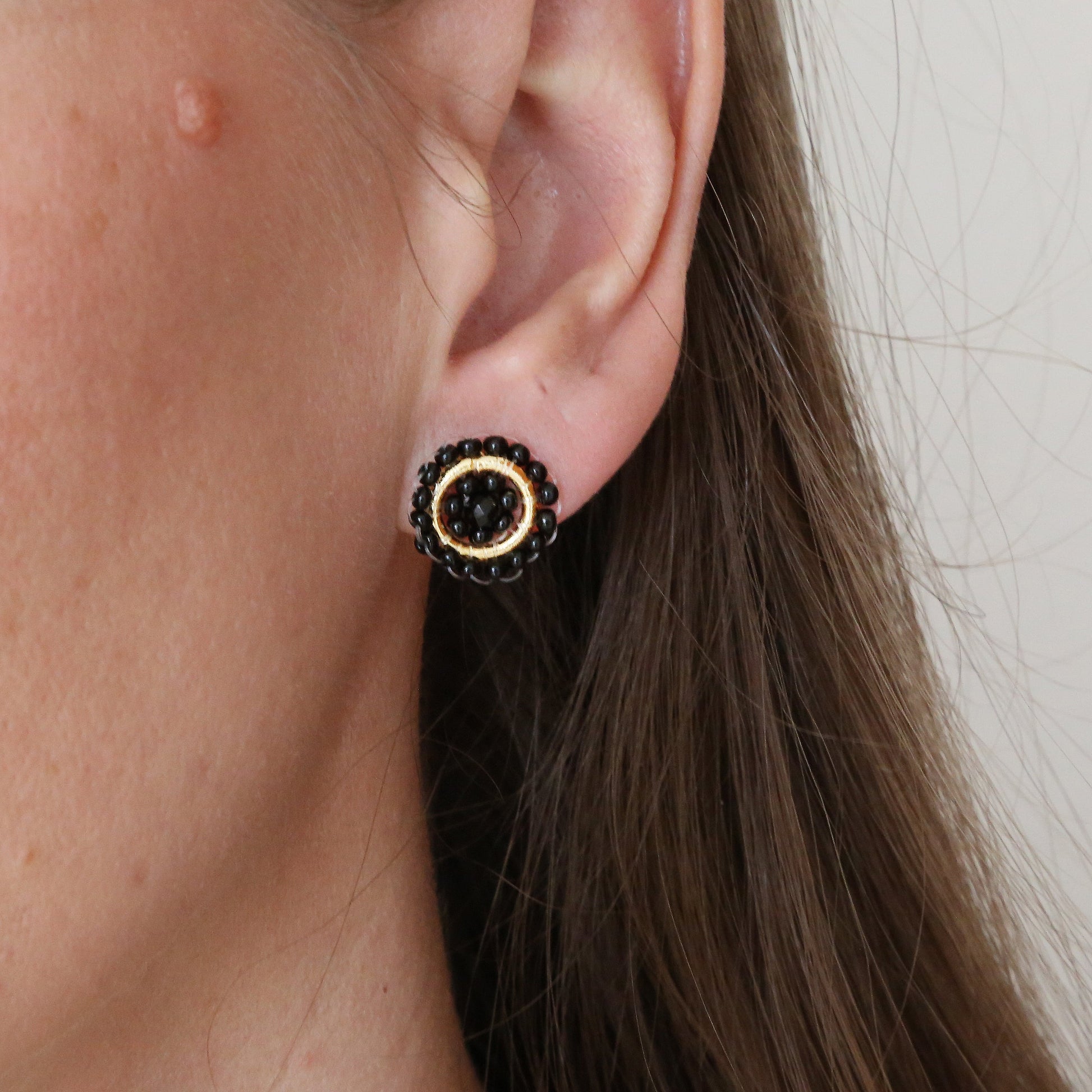 Hand-crafted in Colombia this beaded stud adds a little *pop* without the length. Specifications: Post style earring 0.5 inches in diameter Hand beaded detail with black and gold accents SKU# E1126