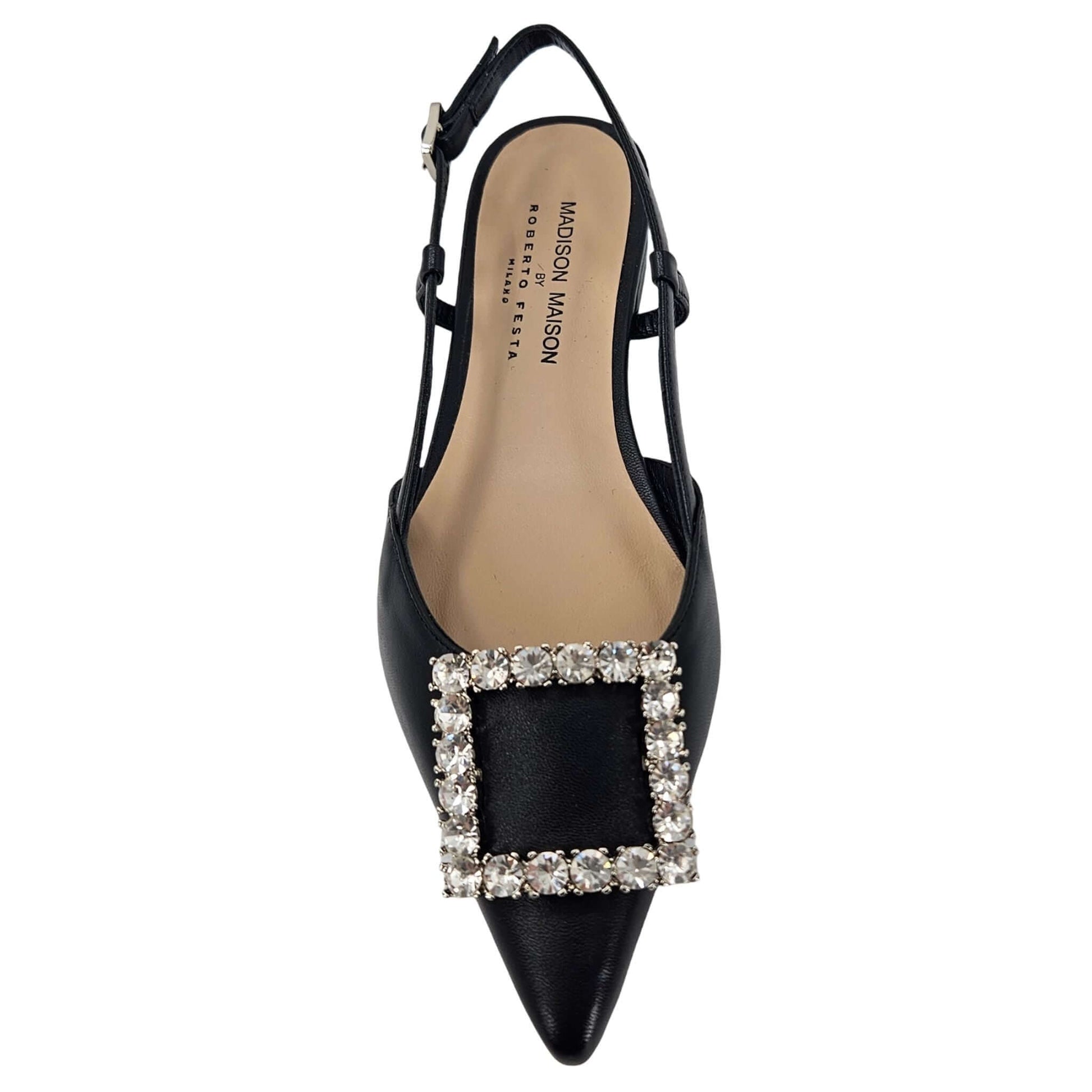 Elevate your wardrobe with these Italian handmade slingback flats by Madison Maison. Crafted entirely from premium leather, these pointed-toe flats feature a dazzling crystal-embellished buckle for a touch of glamour. The adjustable slingback strap ensures a secure and comfortable fit, while the minimal heel offers effortless elegance for all-day wear.