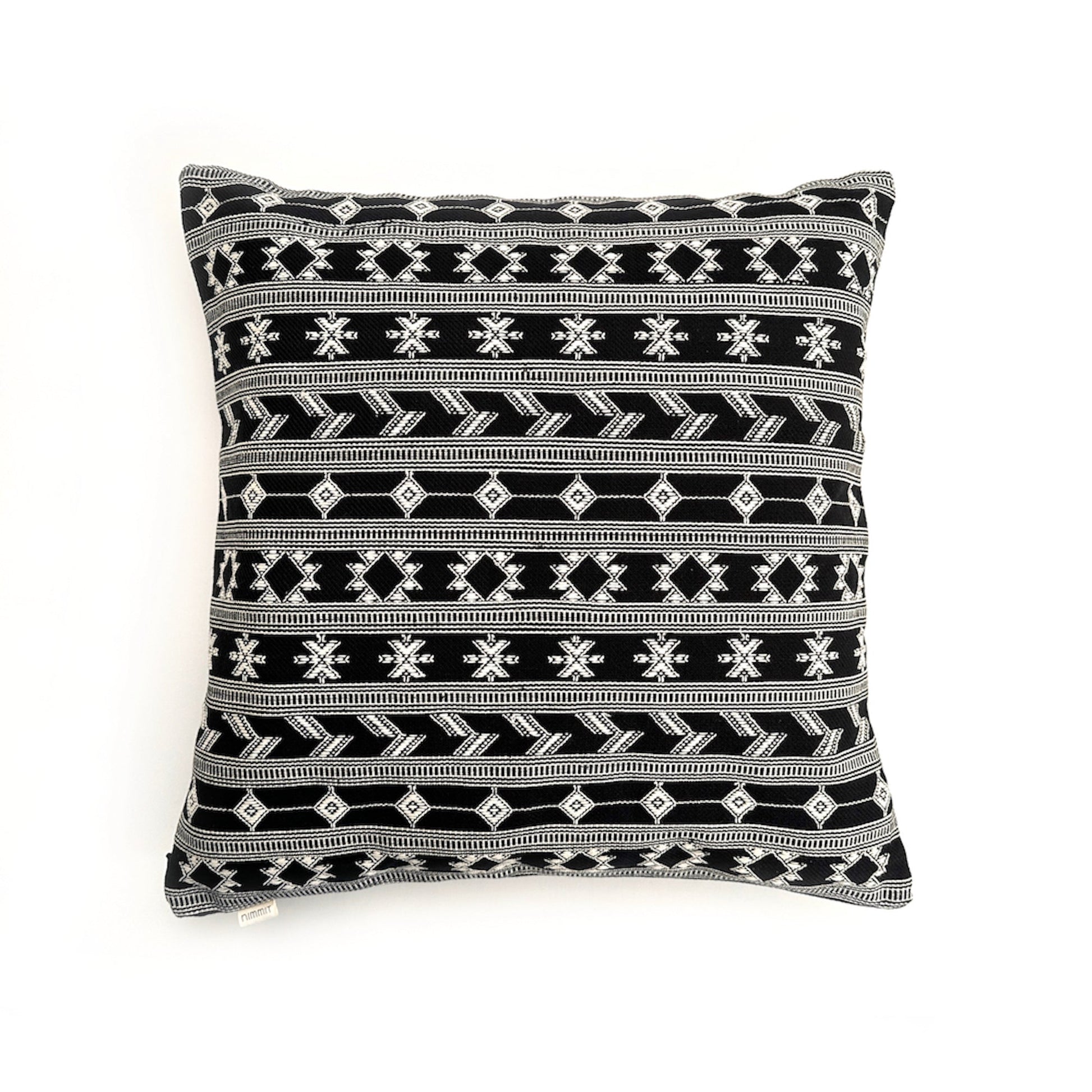 100% Organic Cotton handloomed, handwoven front with plain back pillow cover and a bottom invisible zipper. Nimmit started with two handloom weavers in 1975 and in the beginning of 2020 and now work with approx 61 looms engaged in Kala cotton and Mashru weaving. Tribal textiles are woven on a loin-loom, a type of back-strap loom commonly used by hill people. The warp of manageable length and breadth is prepared and fastened at one end generally to the wall of a house or to two fixed poles while the other is tied to the waist of the weaver with a cotton or leather belt. Sometimes the belt is woven out of cane or bamboo.