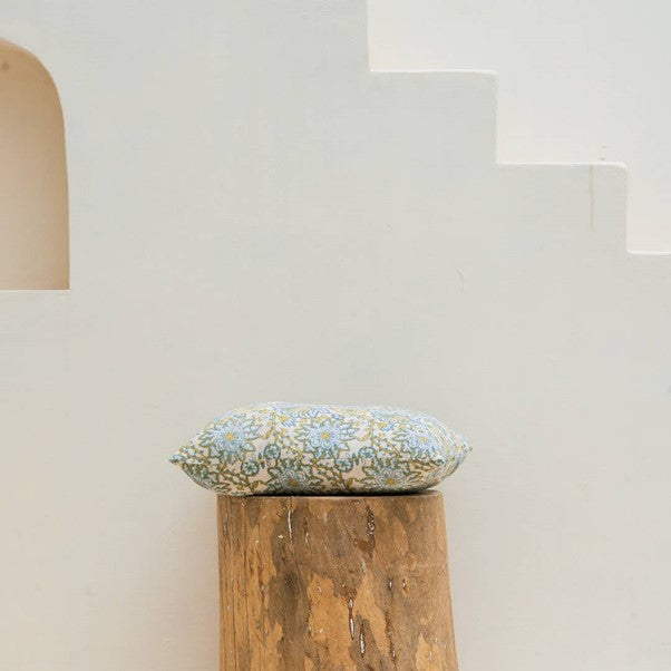 Joyful, fresh, and full of character - this 100% cotton pillow cover features a hand blockprinted floral pattern in soft, sun-washed colors. The multicolor palette brings together blush, ochre, and leaf green in a way that feels both playful and grounded. Each cover is printed using traditional hand-carved wooden blocks by artisans in Jaipur. The slight irregularities in print and color placement are part of its handmade charm - no two are exactly alike, and that’s what makes each one feel personal. The clean square format makes it easy to layer on beds, reading nooks, or lounge chairs. Light yet durable, it's finished with a concealed zipper and cotton backing for a smooth, relaxed finish. Pair it with our Scallop Velvet Moss Pillow Cover for a complete look. Product Details: • 20" x 20" • Without Insert • 100% Cotton • YKK Zipper