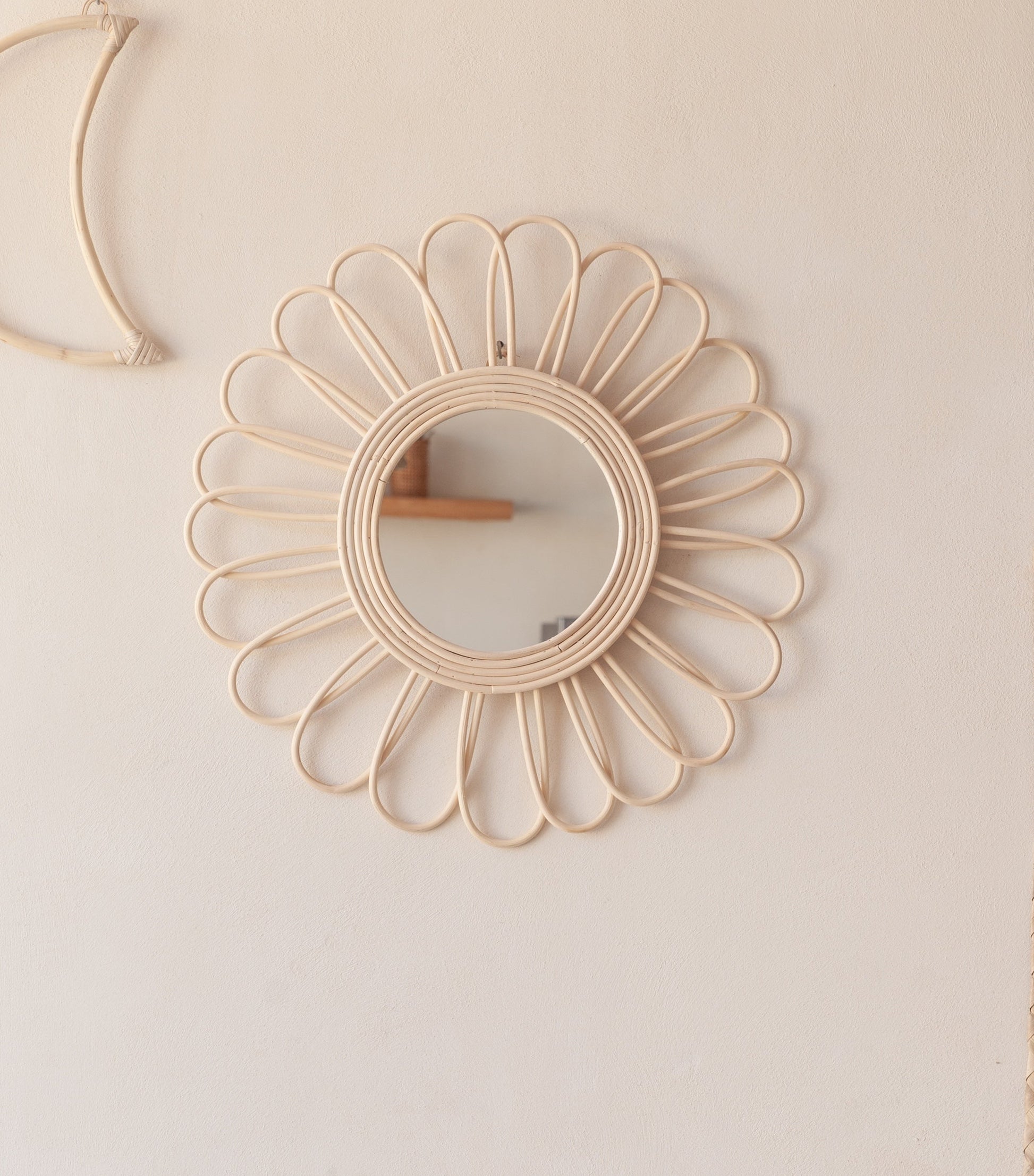 This handcrafted rattan mirror is sure to brighten up your space with its soft lines and natural, light, bamboo coloring. Pairs well with house plants and bright accent walls.