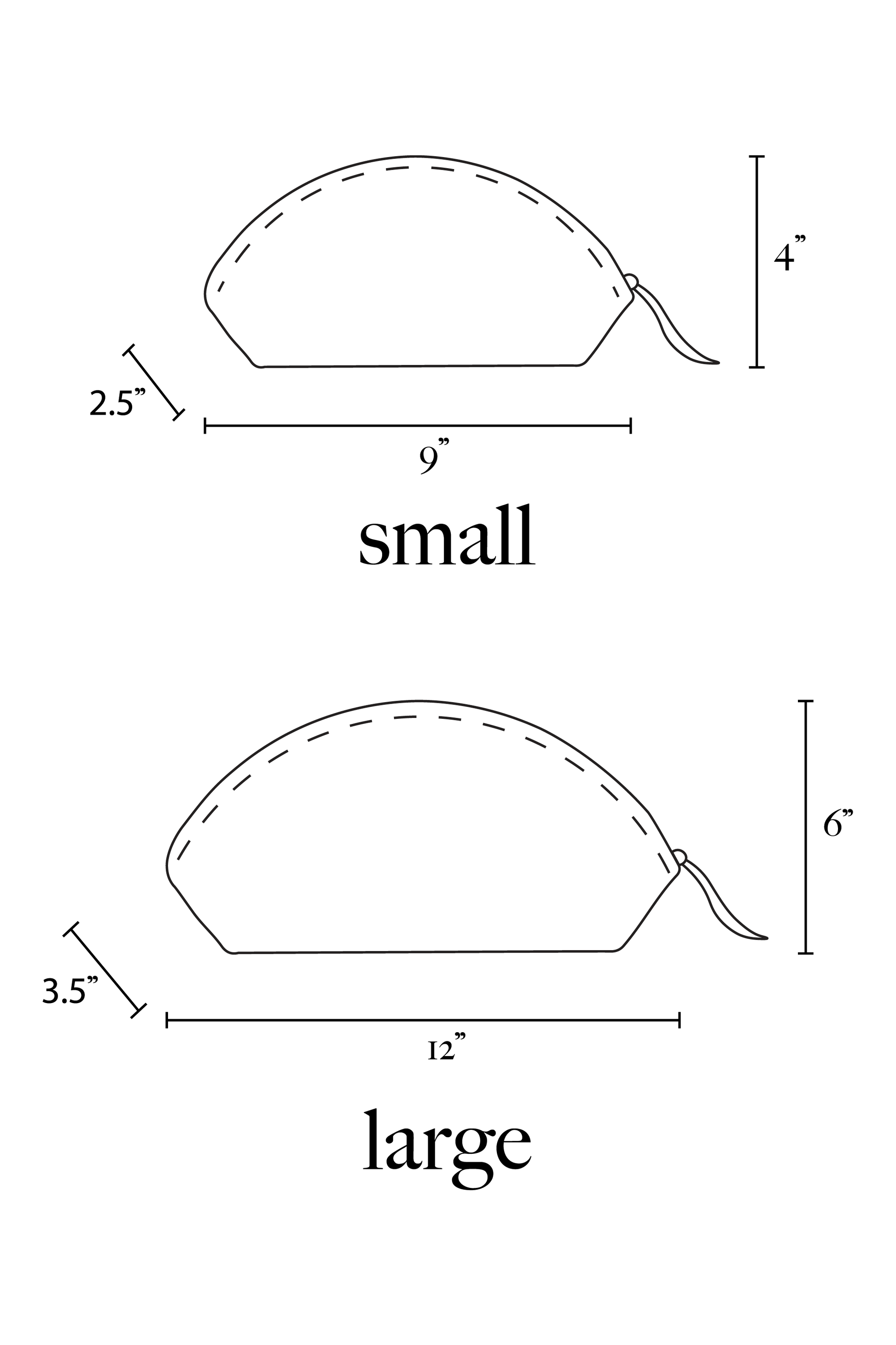 Large pouch measures approximately 12 inches wide, 6 inches tall, 3.5 inches wide