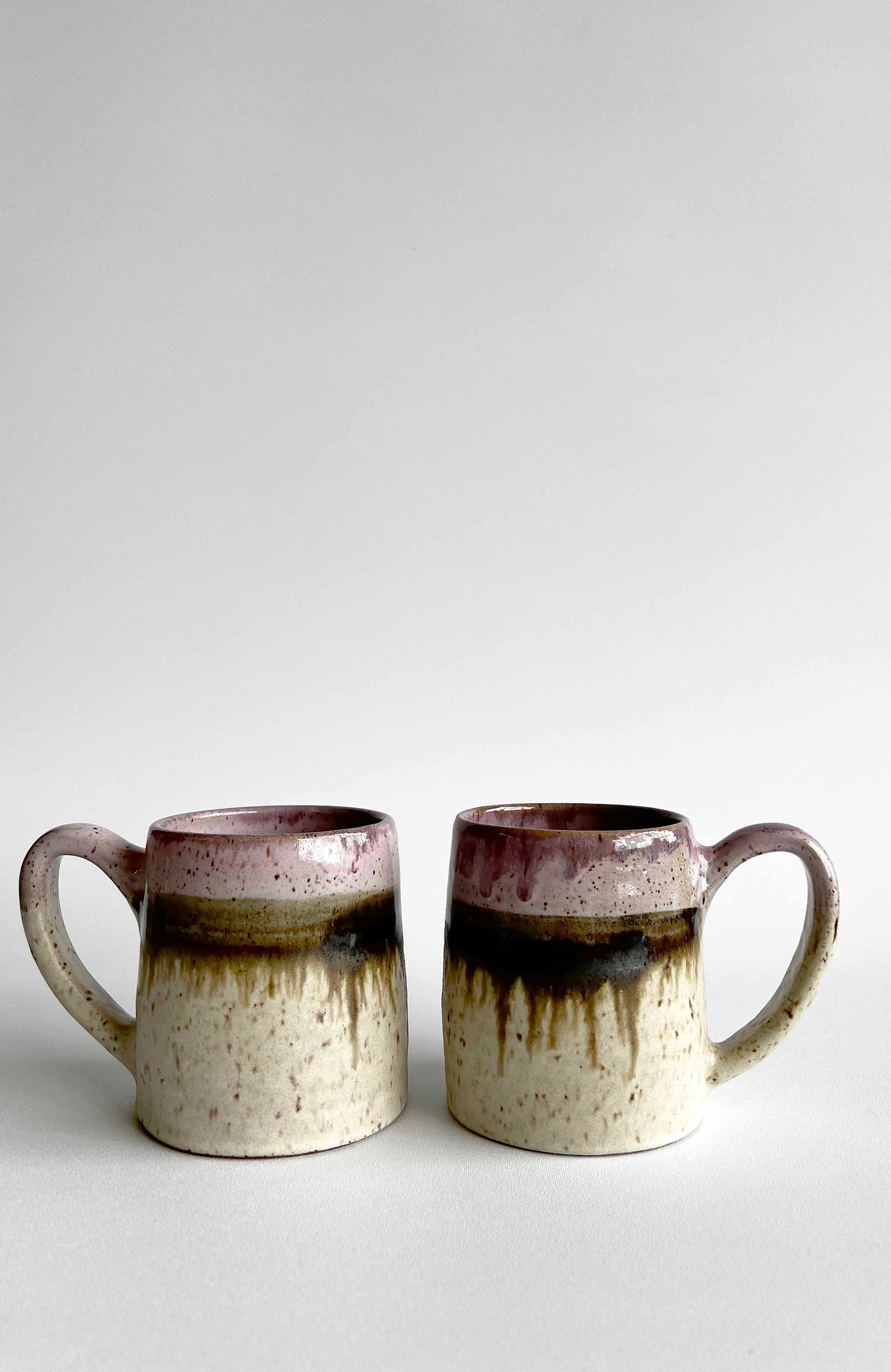 The Borealis Mug in Dusk is an exquisite artisanal creation that displays a stunning glaze similar to the Aurora Borealis. Made from brown stoneware clay with speckles, it offers both aesthetic appeal and practicality. The vivid pink interior, adorned with shades of beige, bronze, and white, makes it a captivating addition to any dining experience. These mugs will always vary in terms of glaze. The beauty of this combo is that no two are ever the same. Some of the mugs have more of a stripe of bronze while in other firings it runs. I have no control over this and please note this is part of the charm of handmade. These are final sale. See the photos for a better understanding of these variations. Approximately measuring 4 inches in height and 4 inches in width, this mug has a capacity of 16 fluid ounces. *All of my products are made by hand and will vary. Each glaze firing varies as well. Please keep this and my refund policy in mind when you place your order. Thank you. It is also safe to use in both microwaves and dishwashers. Each mug is sold separately.
