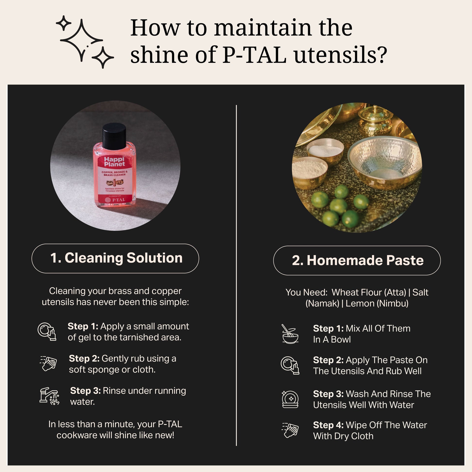 Give your cooking a healthier taste with the Flat base Brass Kadhai. Ideal for deep-frying due to the larger feast surface area, this can be used for regular cooking too. The lid helps in covering & keeping food fresh. Being non-stick cookware, the Kadhai is an appropriate addition to your easy handling of the kitchen. A rare product of ample use, stylish look & healthy cooking! Size in Inches (lxbxh): 11 x 11x 4 Finish: Hammered Golden ( Handcrafted in pure Brass) & tin-coated so silver on the inside. Weight : 4.7lbs Capacity: 0.87 Gal Note: Any variation in weight & size is the characteristic of handcrafted products. FAQs 1.Is it Non-Stick? Yes, the tin coating on the kadhai makes them non-stick & easy to use cookware. 2. Is it safe to cook all types of food? Brass kadhais with tin coating are absolutely safe & can be used for cooking all types of food. Though you may not require Kalai for deep frying since fats do not react with brass. 3. After how long will it require tin coating (Kalai) again ? It completely depends on your utility, the more you use it the sooner you will require it. Head to our kalaiwala page to learn more about Kalai and to locate kalaiwalas near you Did you know/Interesting Facts? 1. Brass & copper being good conductors of heat when used as cookware helps you save gas. They are a smart step towards sustainability. 2. Do not leave it on gas without oil as Kalai might melt leading to quick fading of the coating.