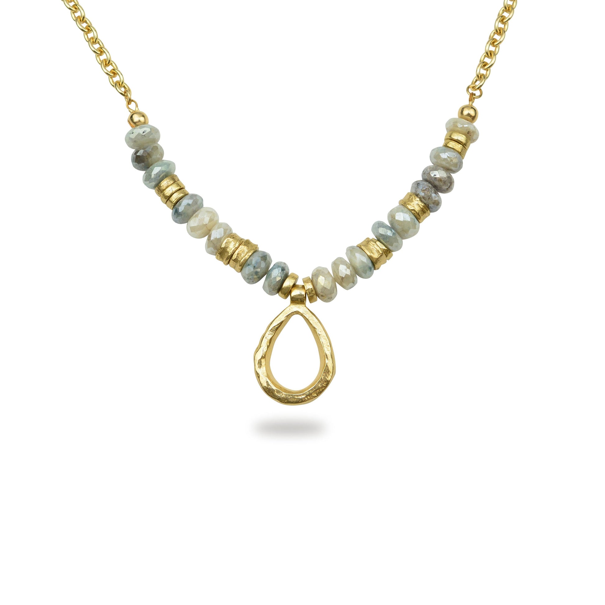 Introducing our handcrafted Celeste Bronze Necklace, a wearable masterpiece suspended gracefully from a luminous gold-filled chain. Adorned with faceted silverite gemstones and an assortment of bronze beads in varying sizes and shapes, this necklace is a celebration of artful design and unique craftsmanship. The combination of warm bronze and shimmering silverite creates an enchanting piece that effortlessly captures attention. Embrace the allure of handcrafted elegance with this pendant, where every element tells a story of meticulous creation and distinctive style.