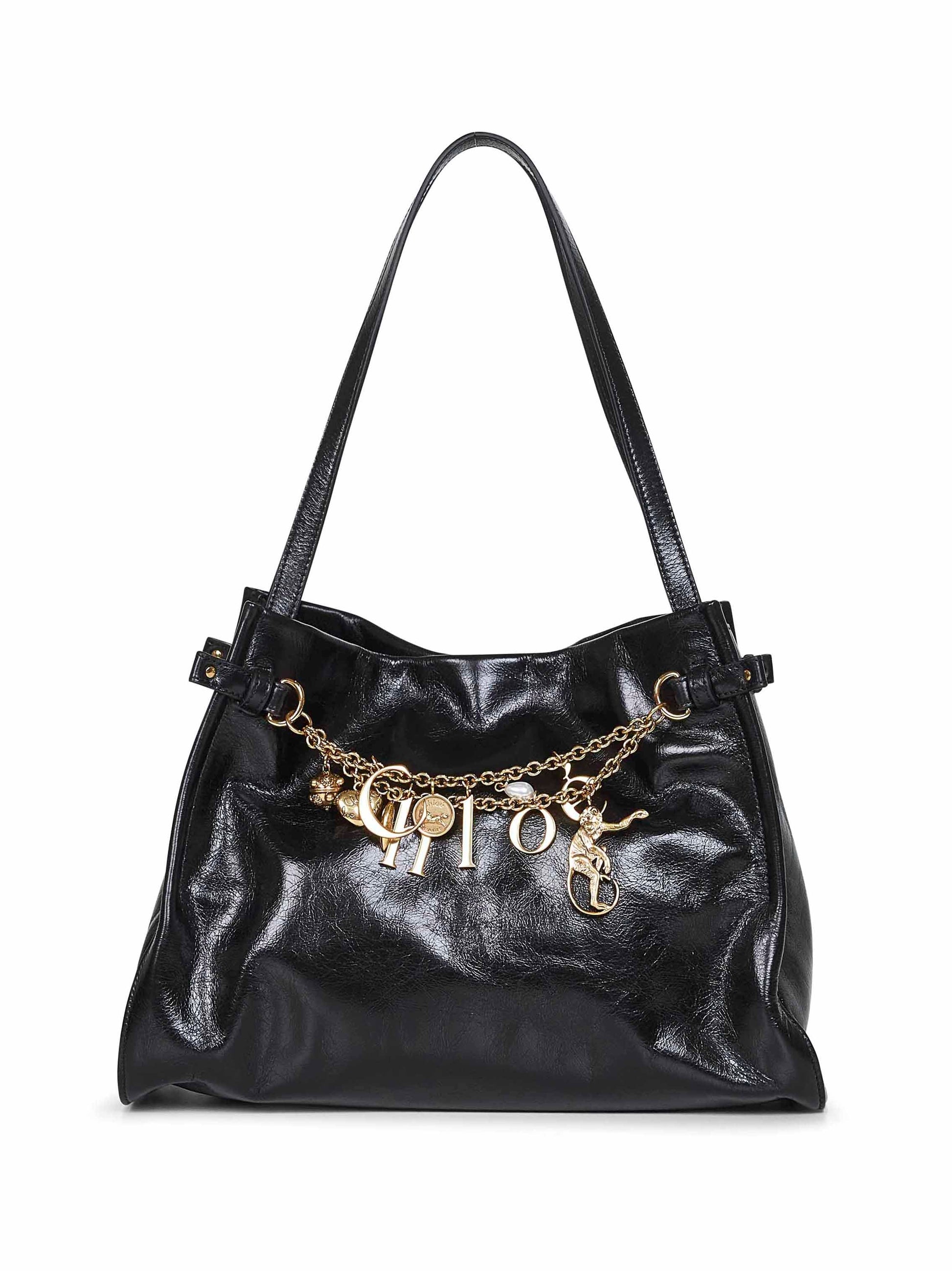 •Magnetic fastening •Double top leather handle •Double metal chain at front with dangling charms and Chloé letters •Interior: one main compartment, one flat pocket; canvas lining •Gusseted sides with leather straps •Gold-toned metal hardware •Soft curved shiny calf leather design •33 X 25 X 19; handle drop 26.5 cm •Black color •100% Calf Leather •Made in Italy