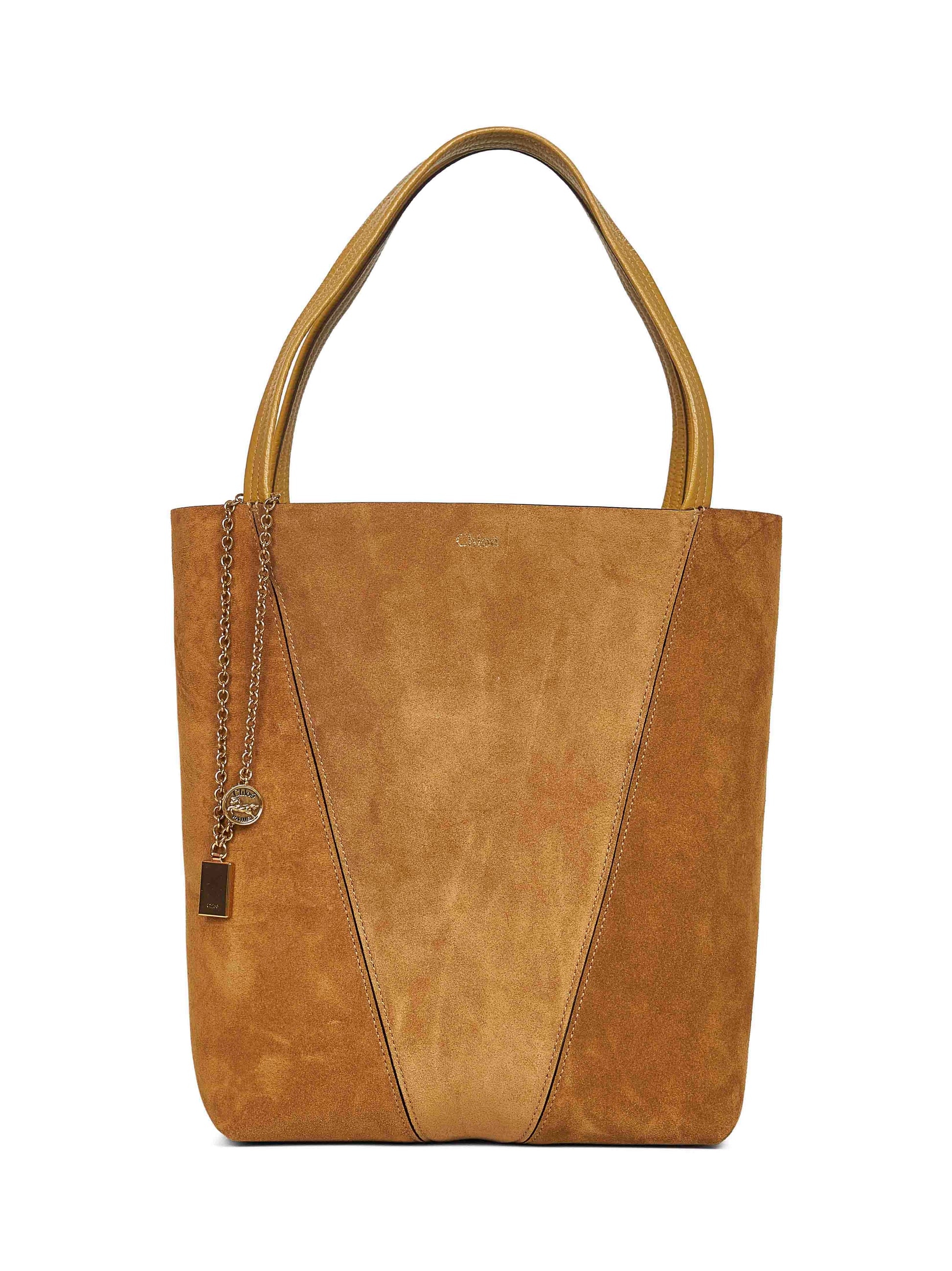 •Open top •Double top leather handle with metal ring •Gold logo at front; dangling chain with Chloé and Horse medals •Interior: one main compartment •Gold-toned metal hardware •Suede calf leather design •27 X 30 X 14 cm: handle drop: 23 cm •Gold khaki color •100% Calf Leather (Bos Taurus) •Made in Italy