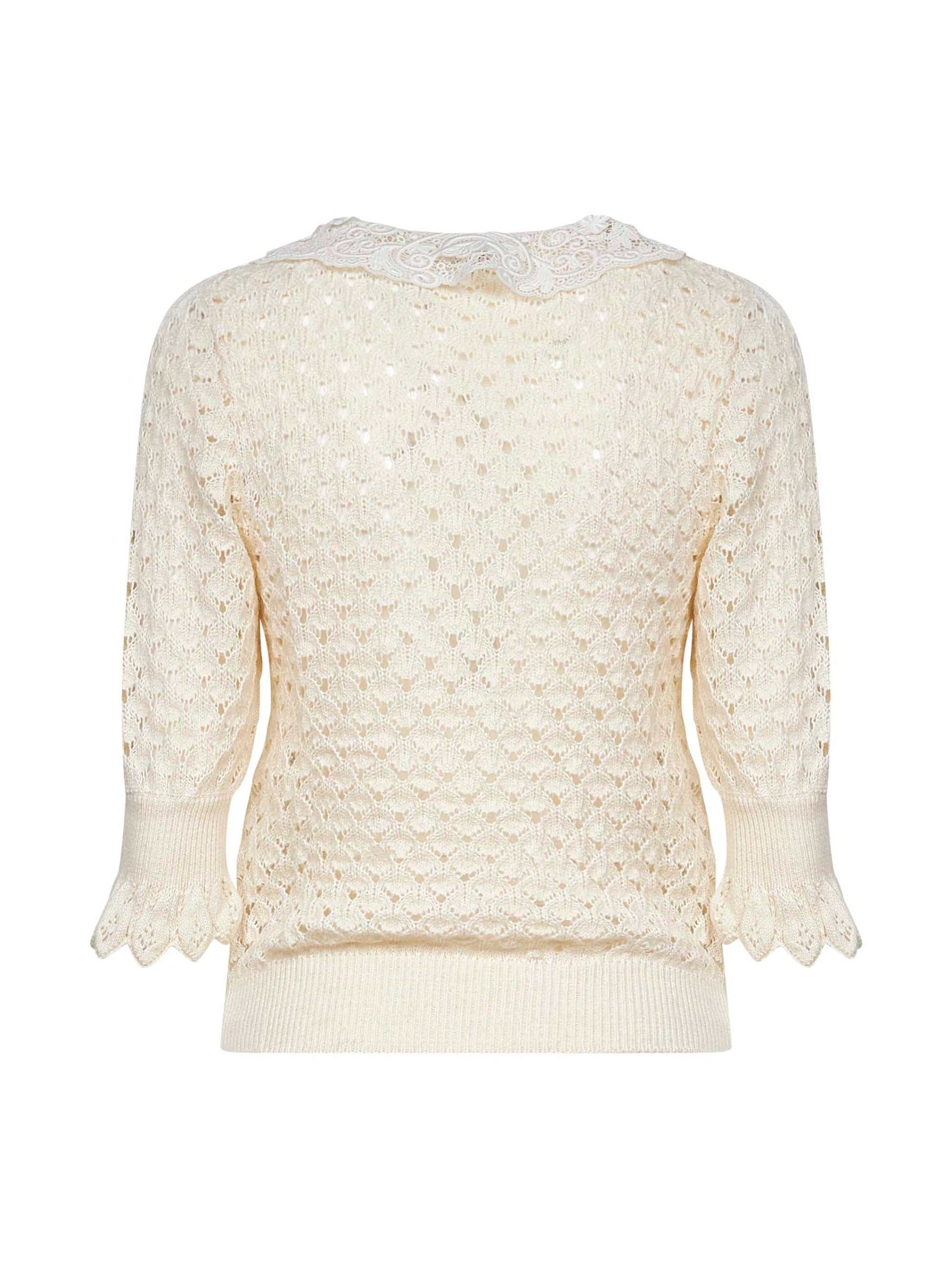 •Front three-button placket; knit-covered buttons •Scalloped macramé lace Peter Pan collar •Three-quarter sleeves, ribbed cuffs with pointelle knit ruffle •Tone-on-tone Chloé logo embroidered at chest •Ribbed bottom band •Pointelle knit design •Fitted fit •Ivory color •70% Cotton, 18% Alpaca Wool, 11% Silk, 1% Polyamide •Made in Italy