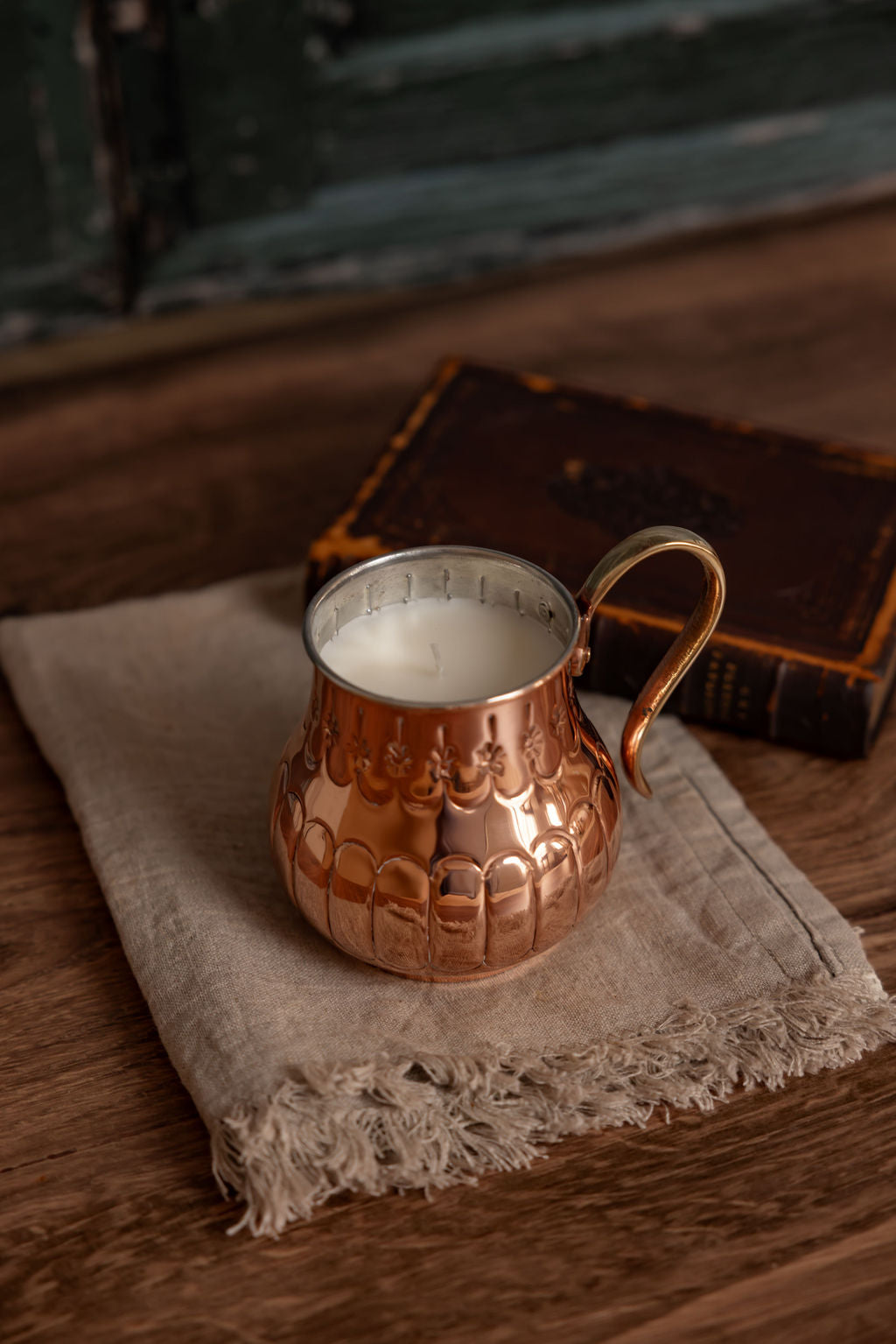 Dimensions: 3" Diameter x 4" H Scent Profile: Top: Lemon Flower, Pamplemousse, Muguet, Apple Blossom Middle: Heliotrope, Sunflowers, Jasmine Bottom: Misted Musk, Ivy Inspired by a vintage copper mug Beth thought would make the perfect candle Fresh and floral, our Apple Blossom Candle is poured into a French-inspired copper vessel based on a vintage mug Beth Ann loved. Fragrant notes of apple blossom, pamplemousse, sunflowers, and musk blend to create a clean, uplifting scent that fills the room with springtime warmth. Once burned, the 18oz soy candle leaves behind a keepsake vessel you can treasure long after the scent fades. At Coppermill Kitchen, we design copper home accents that blend scent, memory, and craftsmanship. Place on a mantel or tray with seasonal greens or florals. Follow care instructions to clean and reuse the vessel for years to come