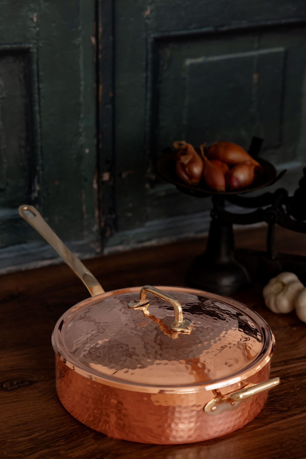 Dimensions: 10.25" Diameter x 3" Deep x 21" L with handle | Holds 3.75 Quarts 2.5mm thick copper | Tin-lined | Hammered finish Handle design inspired by an old French company from the late 1800s A true kitchen statement, our Vintage Copper Large Sauté Pan is where craftsmanship meets performance. Made with 2.5mm thick copper, this tin-lined pan is ideal for searing, sautéing, and one-pan meals. The hammered finish adds texture and heritage, while the **handle design—modeled after 1800s French originals—**offers historic detail and balance. It’s a collector’s piece that begs to be used daily. At Coppermill Kitchen, we create heirloom-quality copper cookware that blends artistry and tradition for today’s cook. Hang it from a rail for a chef-worthy kitchen display or use it to serve rustic dishes straight from the stove. Always hand wash and dry after each use to maintain the lining and hammered finish.