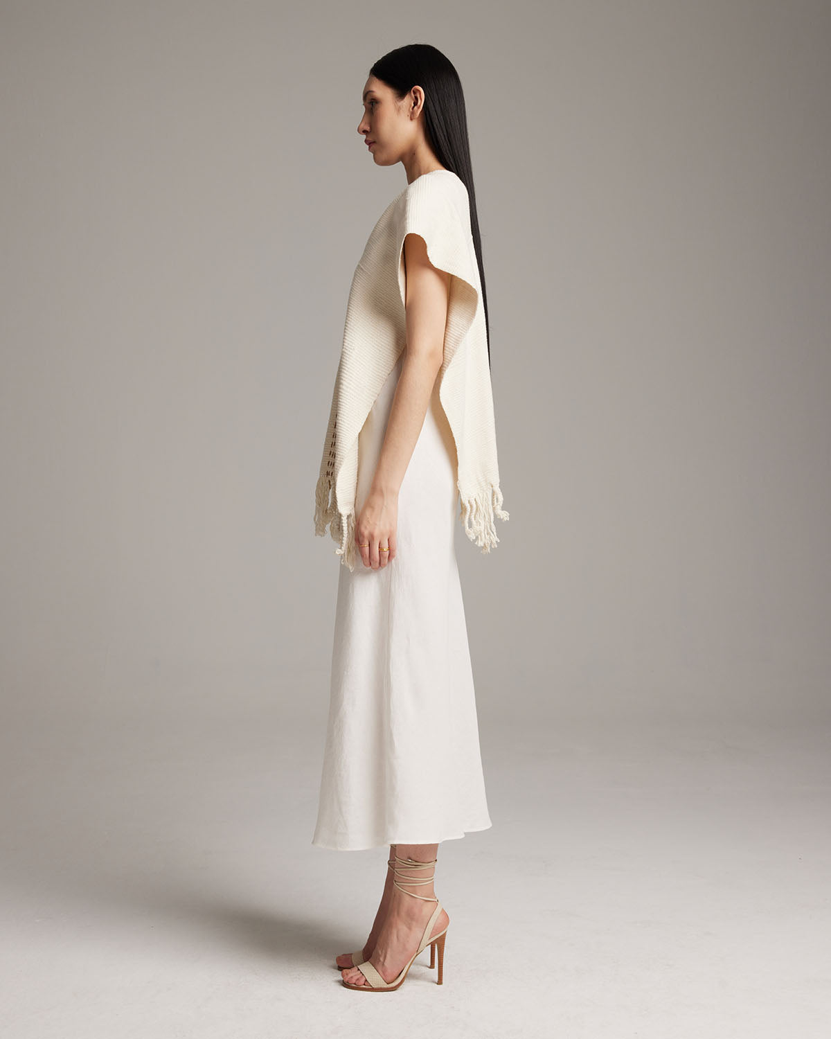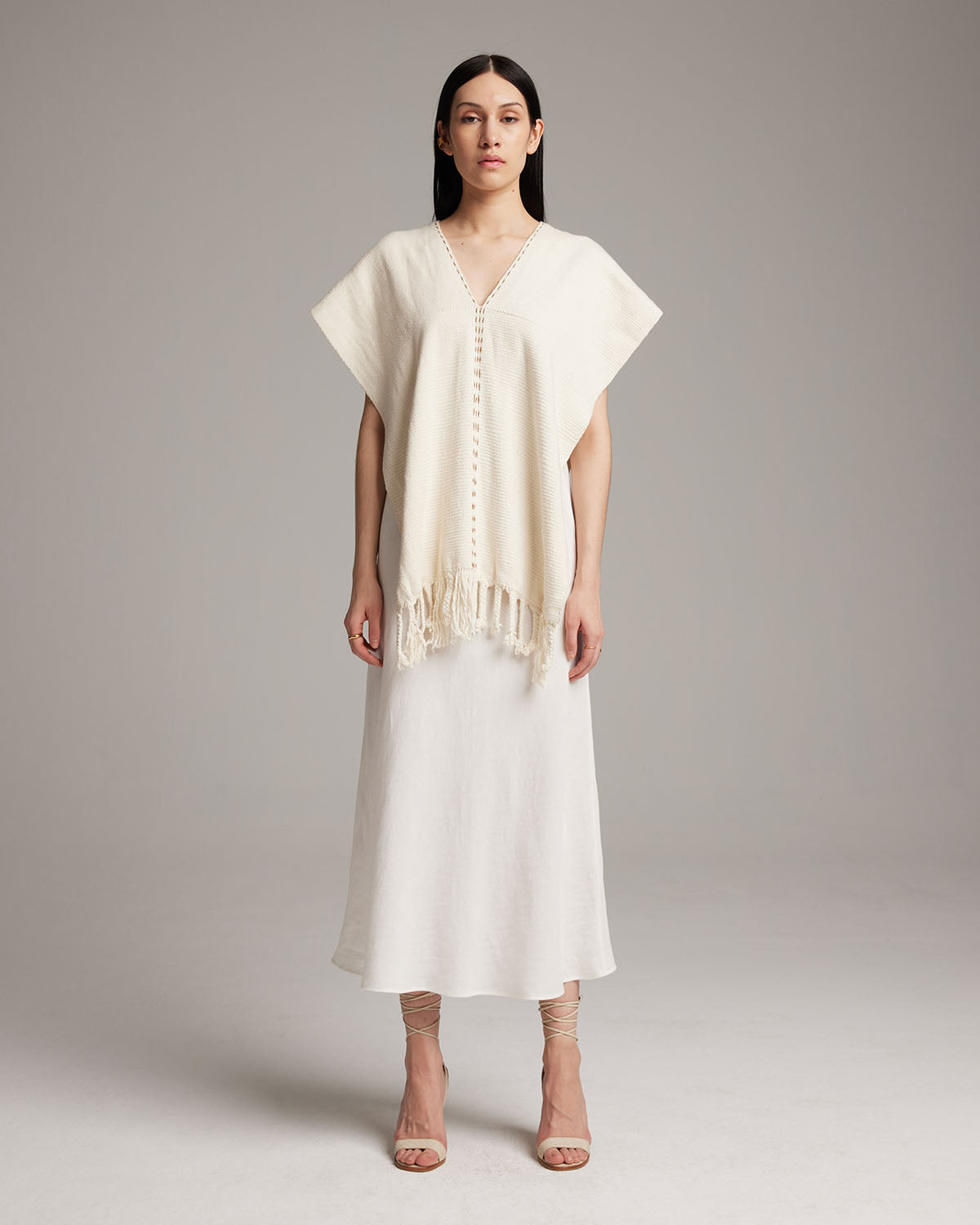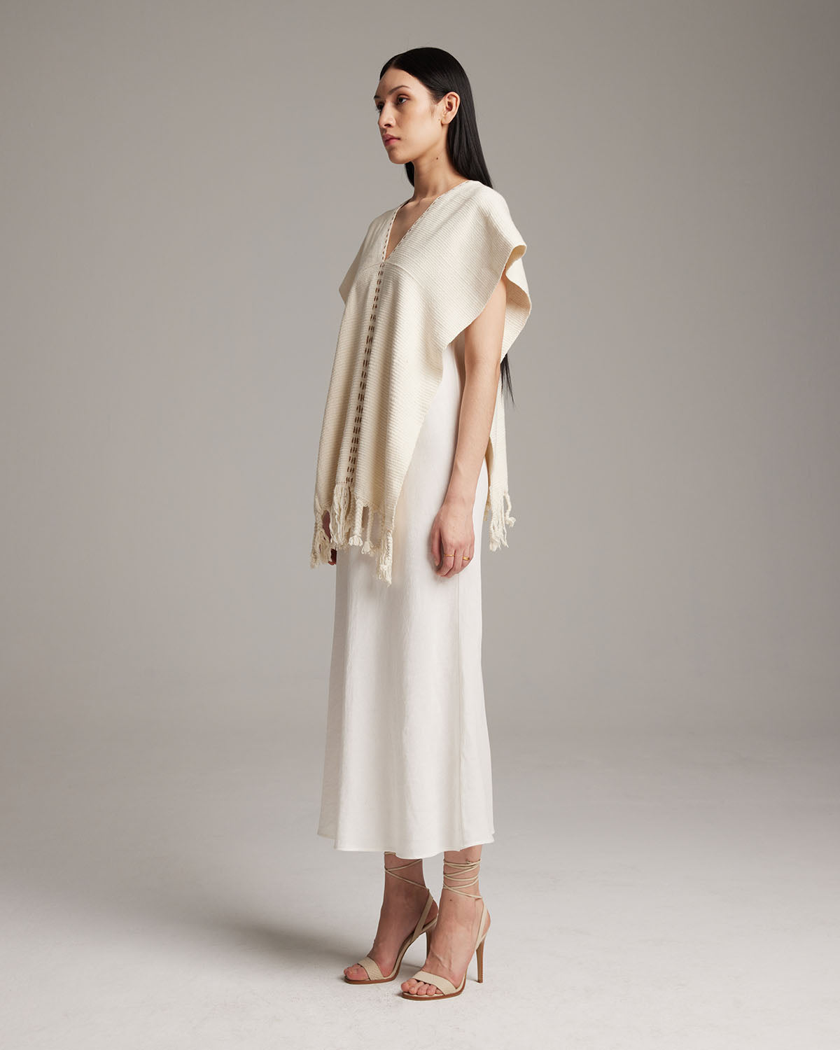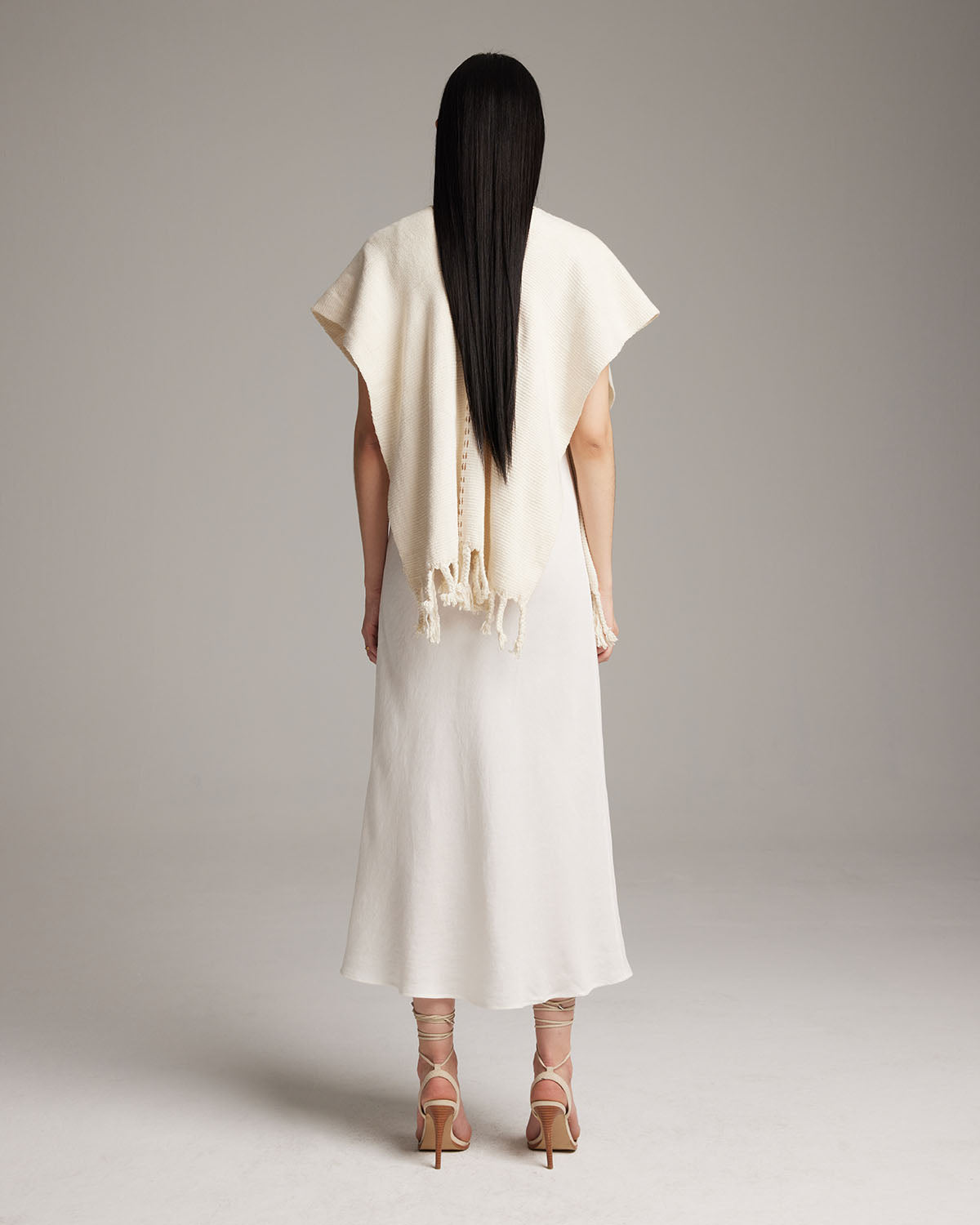 Hand-loomed 100% organic cotton with fringe detail. Features copper and ivory threaded detail down the center. One Size Fits All