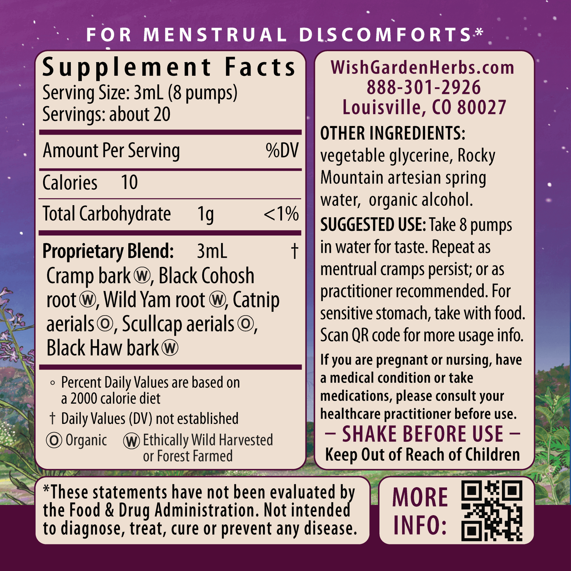 Cramp bark (Viburnum opulus), Black Cohosh root (Actaea racemosa (syn. Cimicifuga racemosa)), Wild Yam root (Dioscorea villosa), organic Catnip aerials (Nepeta cataria), organic Scullcap aerials (Scutellaria lateriflora), Black Haw bark (Viburnum prunifolium), vegetable glycerine, Rocky Mountain artesian spring water & organic gluten-free alcohol.