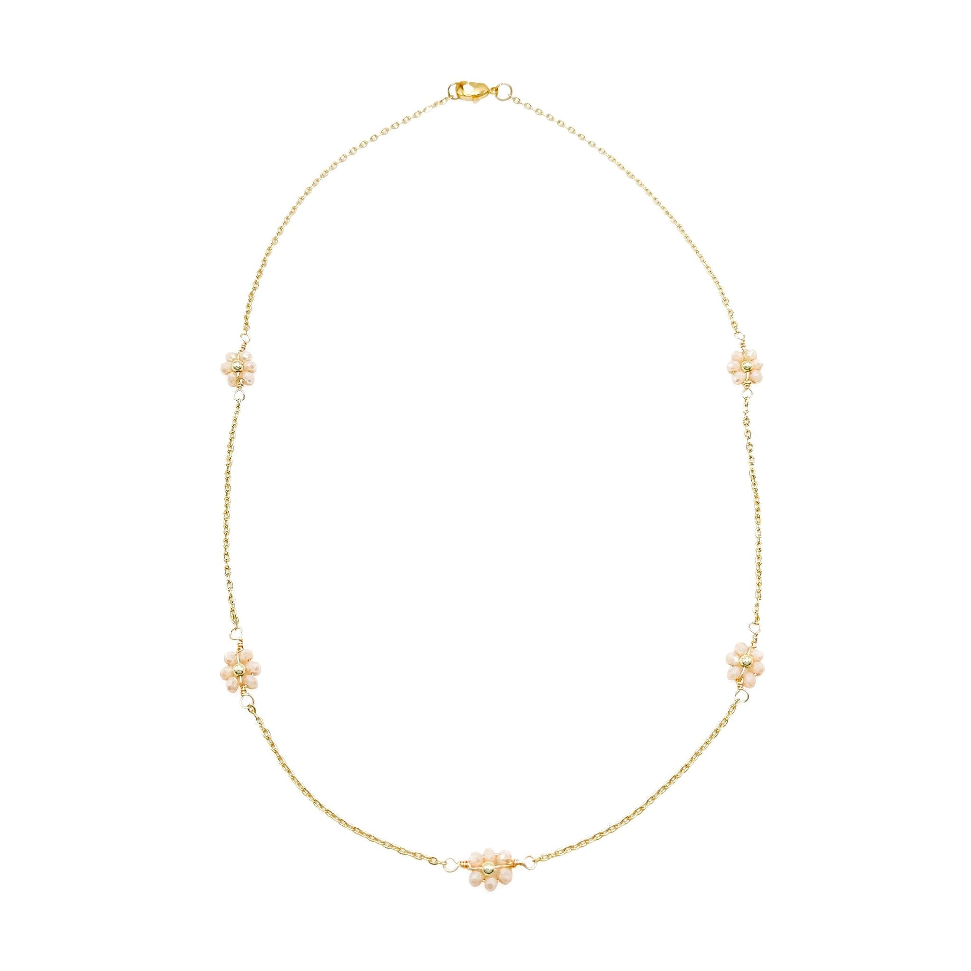 You loved this spring collar necklace in silver, and we've recreated it in gold just in time for spring. Simple white crystal flowers with gold bead centers are stationed around a 18 inch dainty gold cable chain with a lobster clasp and 3 inch extender.