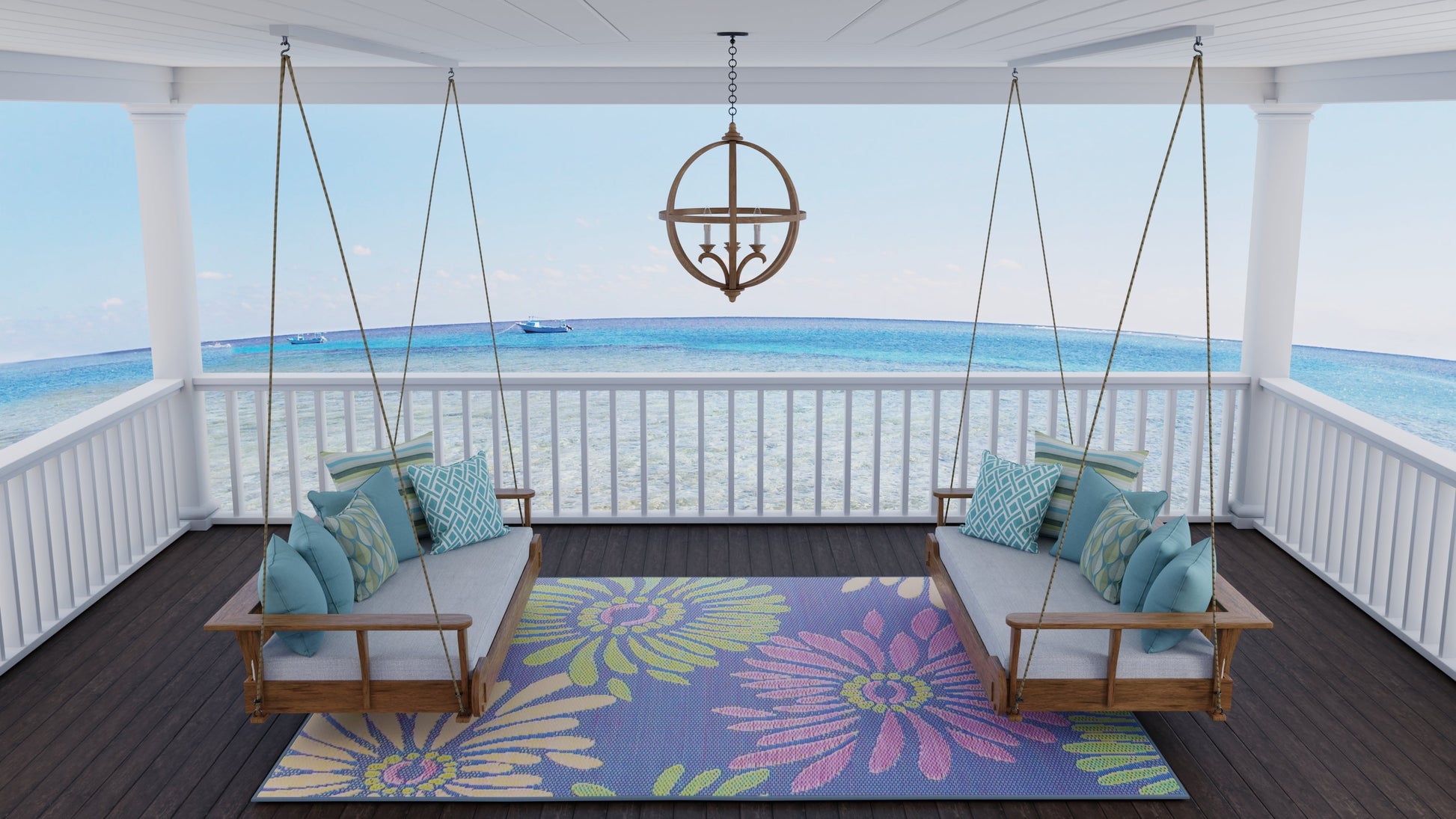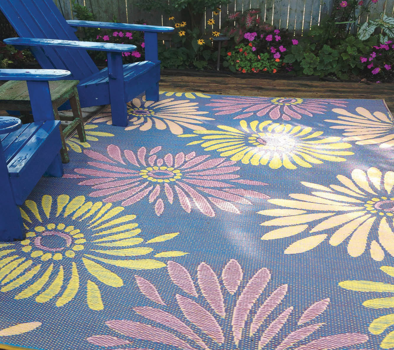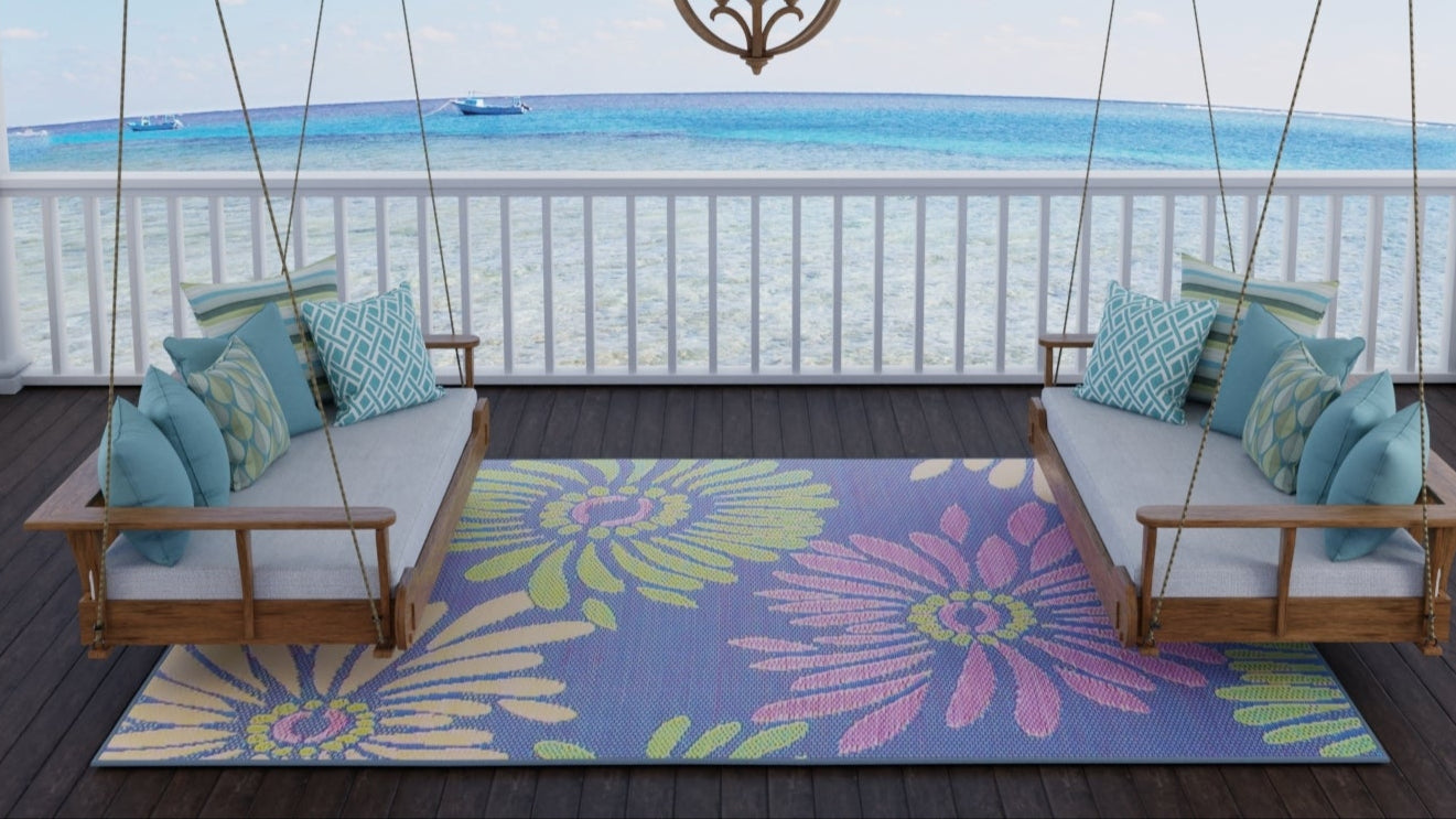 Featuring larger than life flowers against a colorful background, these richly toned, bold rugs are made of recycled plastic for outdoor or indoor use.