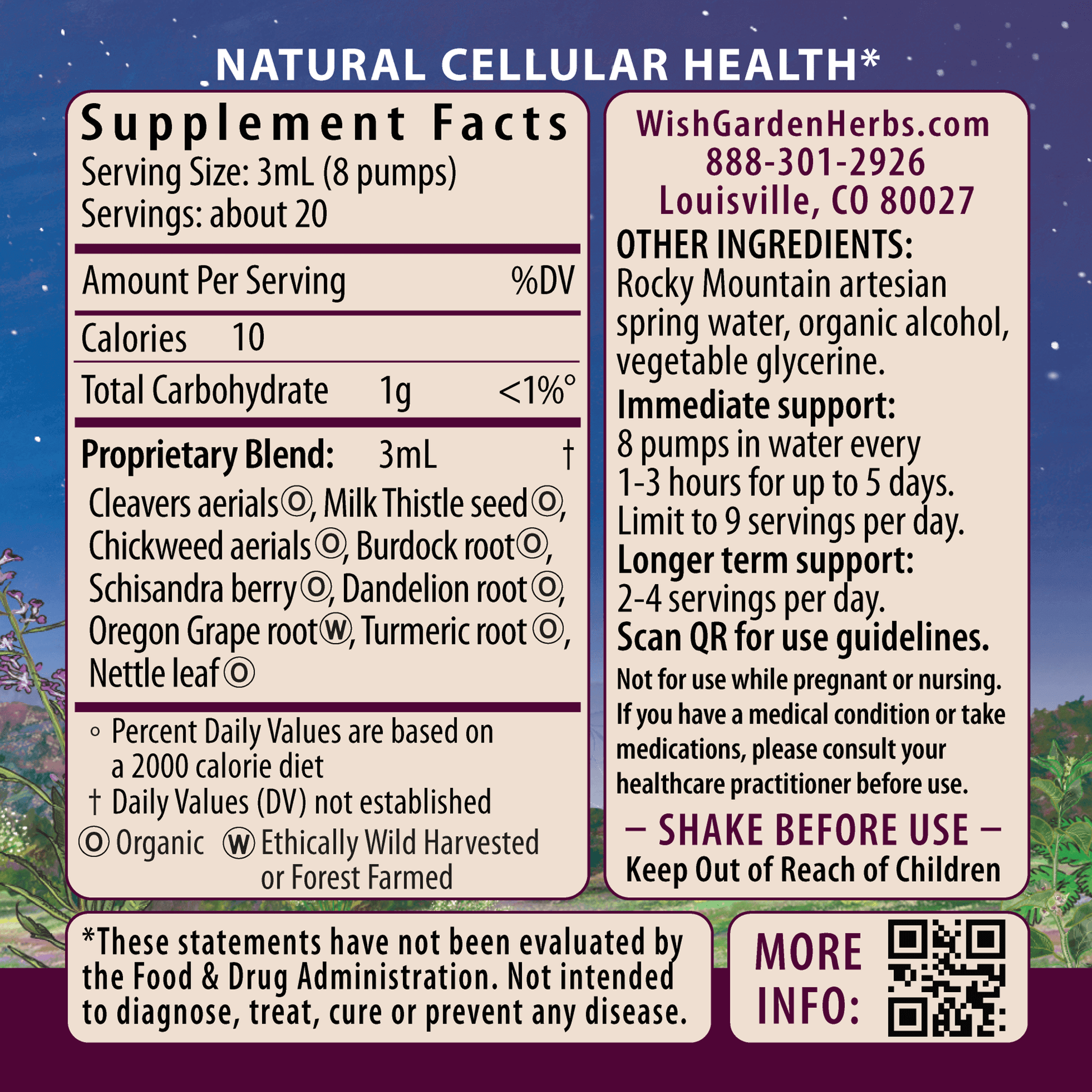 Organic Cleavers aerials (Galium aparine), organic Milk Thistle seed (Silybum marianum), organic Chickweed aerials (Stellaria media), organic Burdock root (Arctium lappa), organic Schisandra berry (Schisandra chinensis), organic Dandelion root (Taraxacum officinale), Oregon Grape root (Mahonia spp.), organic Turmeric root (Curcuma longa), organic Nettle leaf (Urtica dioica), Rocky Mountain artesian spring water, organic gluten-free alcohol & vegetable glycerine.