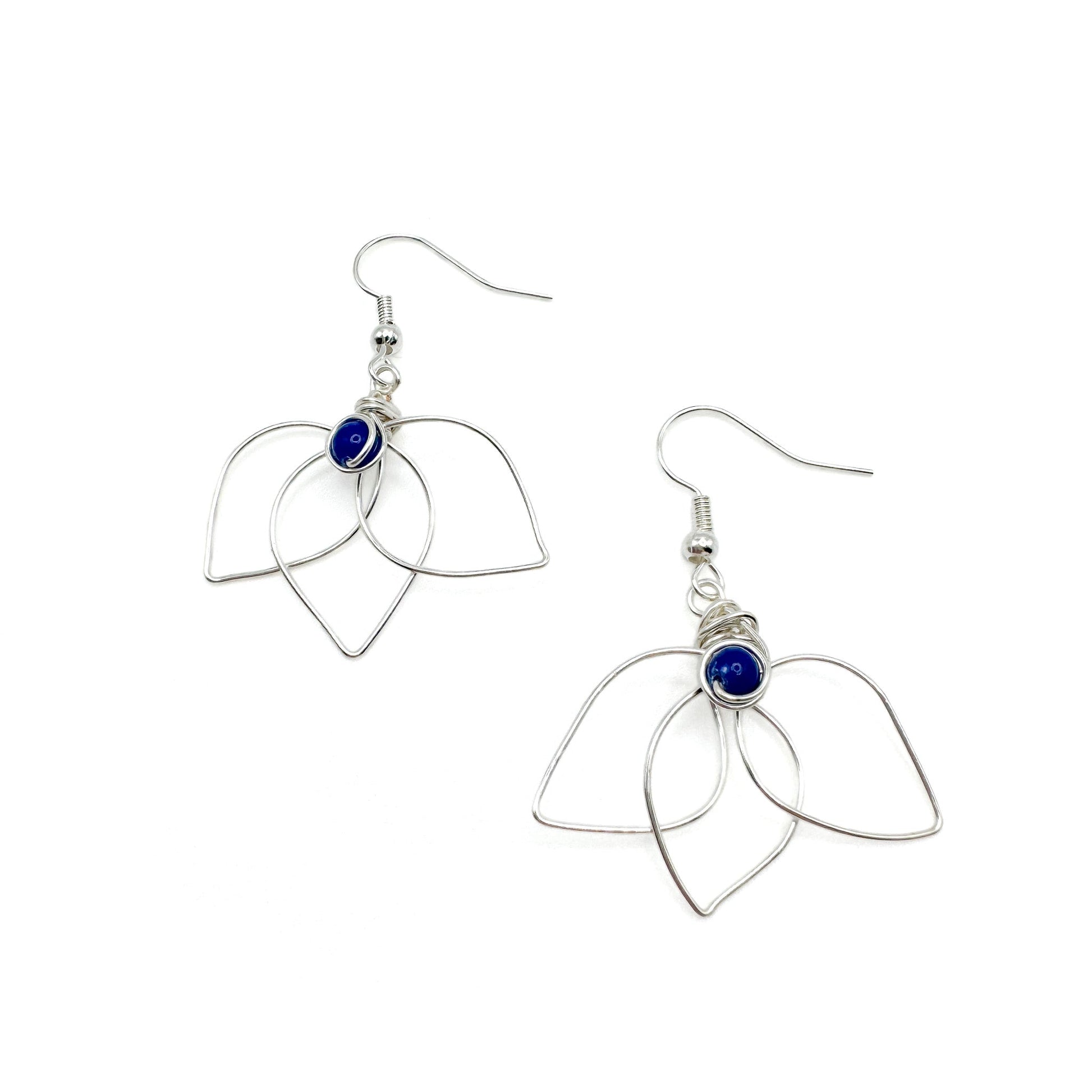 Introducing the Elise earrings, an elegant statement piece that captures the delicate beauty of nature. Crafted with meticulous attention to detail, these earrings feature gracefully draped silver wire flower petals suspended from hypoallergenic silver fishhooks, ensuring both comfort and durability for sensitive ears. Each petal is thoughtfully accented with a rich royal blue jade stone, adding a sophisticated pop of color and depth to your ensemble. Measuring 1 7/8 inches in total length, the Elise earrings strike the perfect balance between presence and wearability, making them ideal for both everyday elegance and special occasions. The hypoallergenic construction means you can wear them with confidence, knowing they're gentle on your skin. For a cohesive, curated look, pair these stunning earrings with the Mountain Breeze necklace and bracelet collection to create a harmonious jewelry ensemble that speaks to refined taste and timeless style.