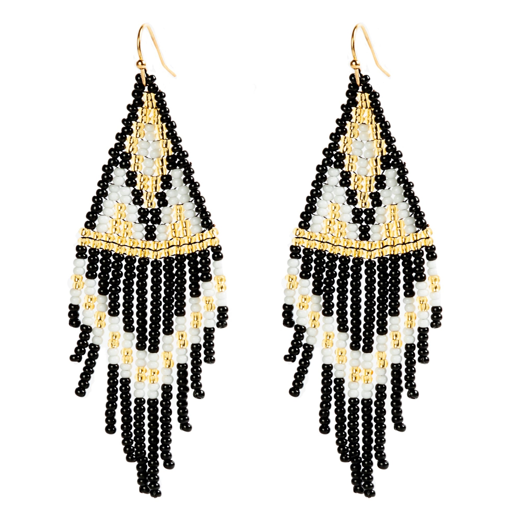 Hand woven by indigenous Embera Chami artisans, these seed bead earrings represent a piece of Colombian culture, fusing modern designs with ancient tribal craftsmanship. The Embera Chami tribe are known for their intricate and colorful bead work and these earrings do not disappoint. Each pair features beautiful bead detailing in a unique FOSTERIE exclusive small batch pattern. Materials: Seed beads Size: Approximately 3.5 inches from top of hook, 1 inches wide