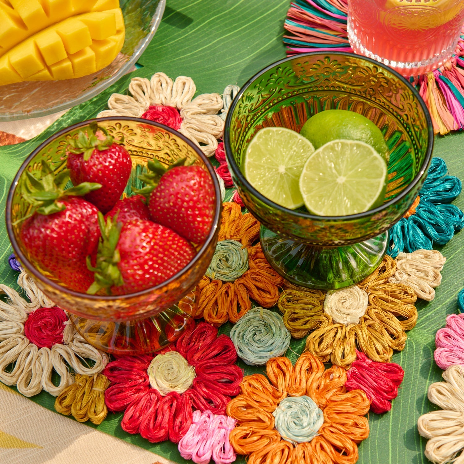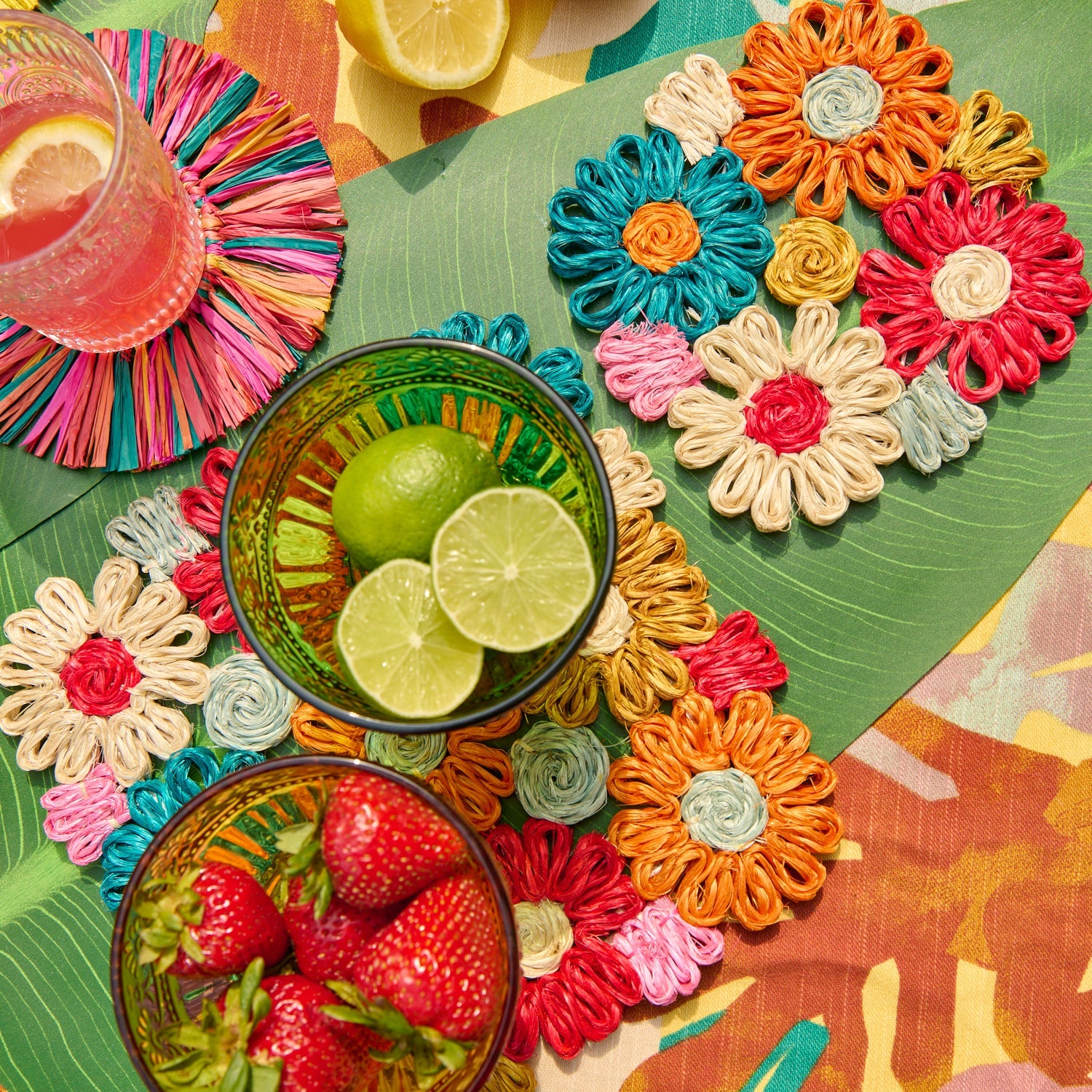 Protect your surfaces in style with the Fleur Woven Abaca Trivets, a set of two meticulously handwoven pieces. Featuring intricate floral patterns, these trivets are made from durable and eco-friendly abaca fibers, blending beauty and functionality. Ideal for hot dishes or as decorative accents, they bring an exciting pop of color to any table setting.