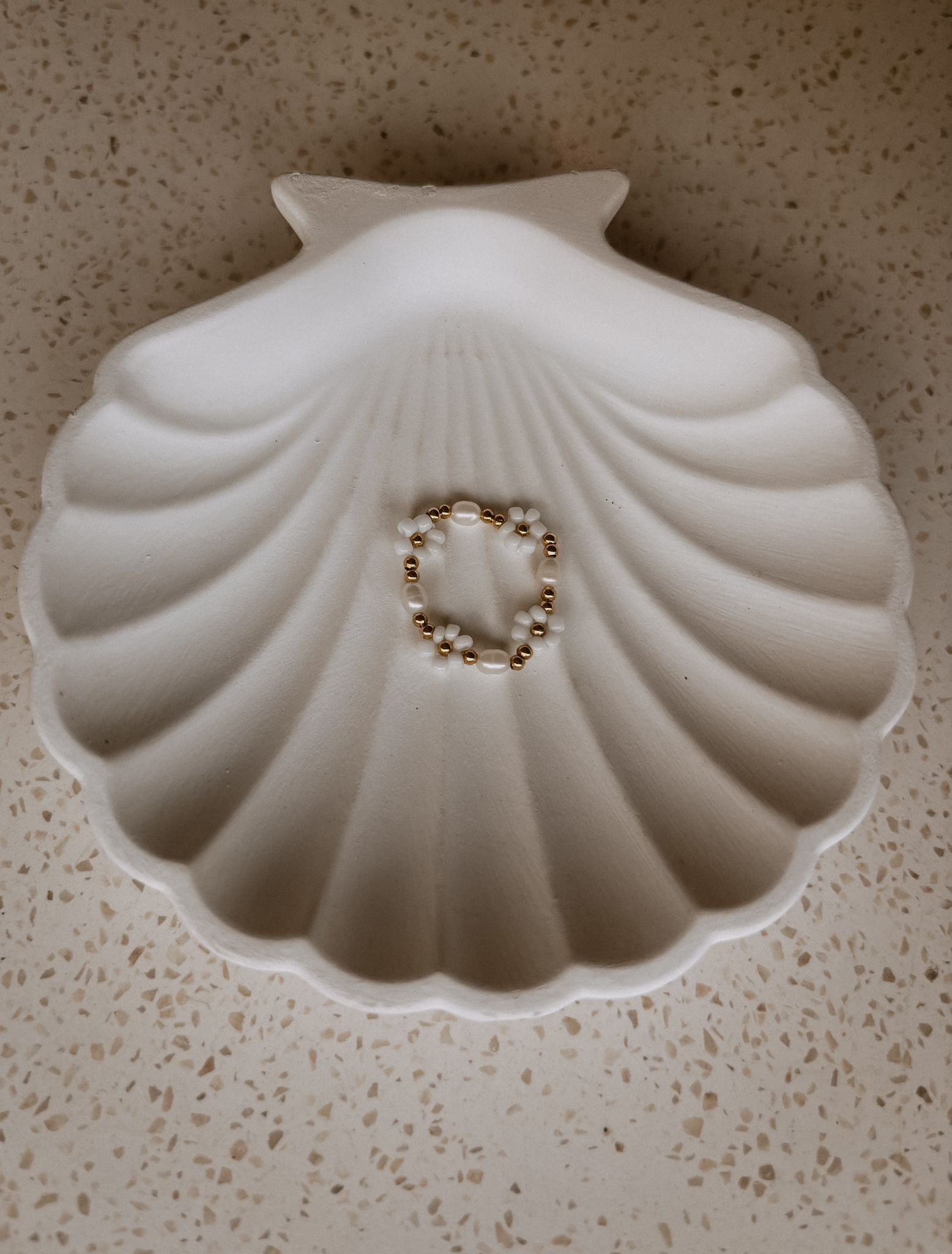 Experience the ultimate in elegance with this handcrafted jewelry set, featuring a bracelet, necklace, and ring adorned with freshwater pearls and beaded flowers. Each piece is designed to complement the other, creating a harmonious blend of white and gold tones. The adjustable necklace with a gold clasp, paired with the elastic bracelet and ring, ensures a comfortable fit for all. This dainty set adds a refined touch to any outfit, making it a versatile and timeless addition to your collection.