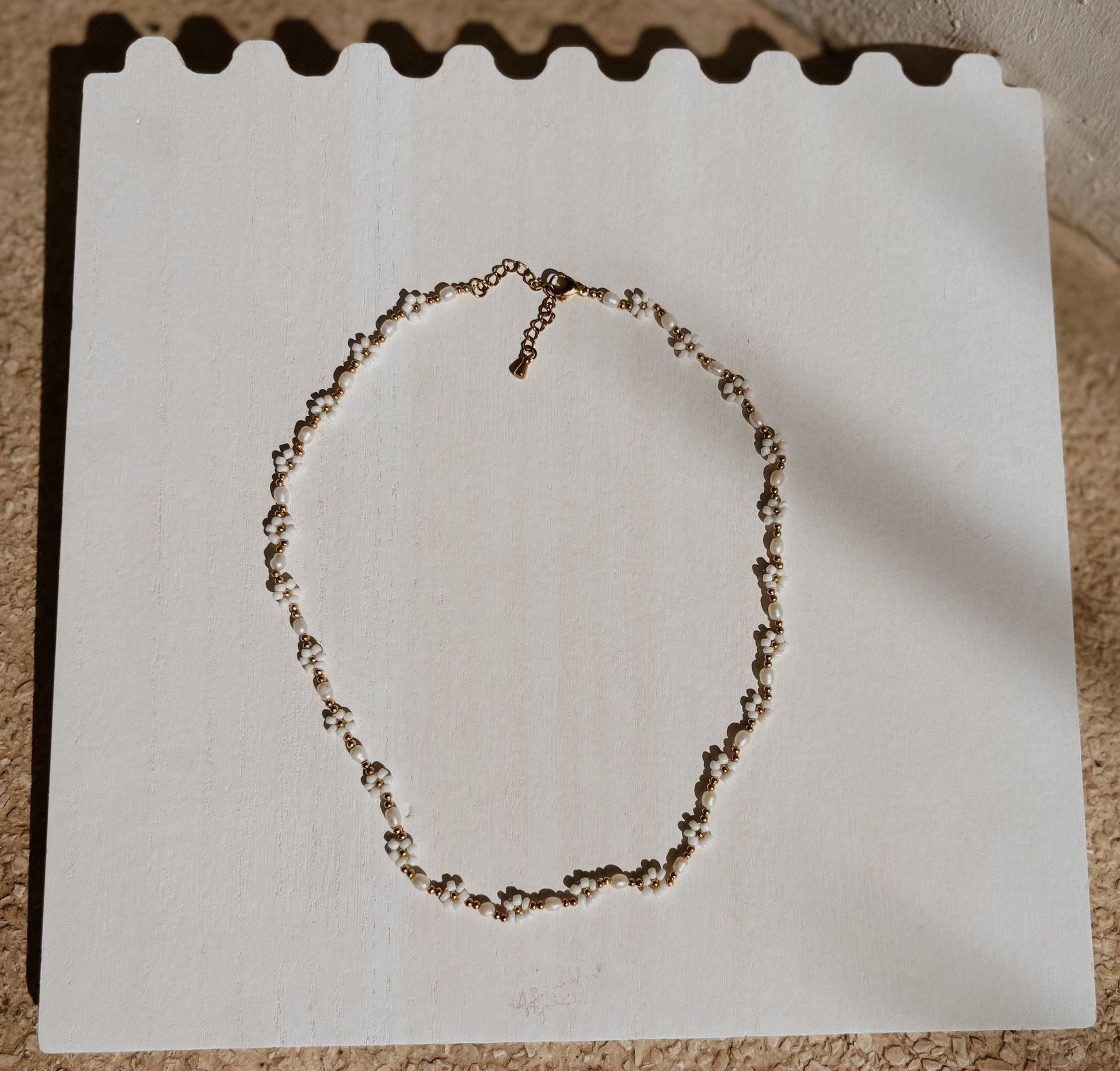 Complete your ensemble with this handcrafted necklace featuring radiant freshwater pearls and intricate beaded flowers. The adjustable gold clasp allows for a perfect fit, making it a versatile addition to your jewelry collection. With its elegant blend of white and gold, this necklace adds a touch of sophistication to any outfit, effortlessly enhancing your style.