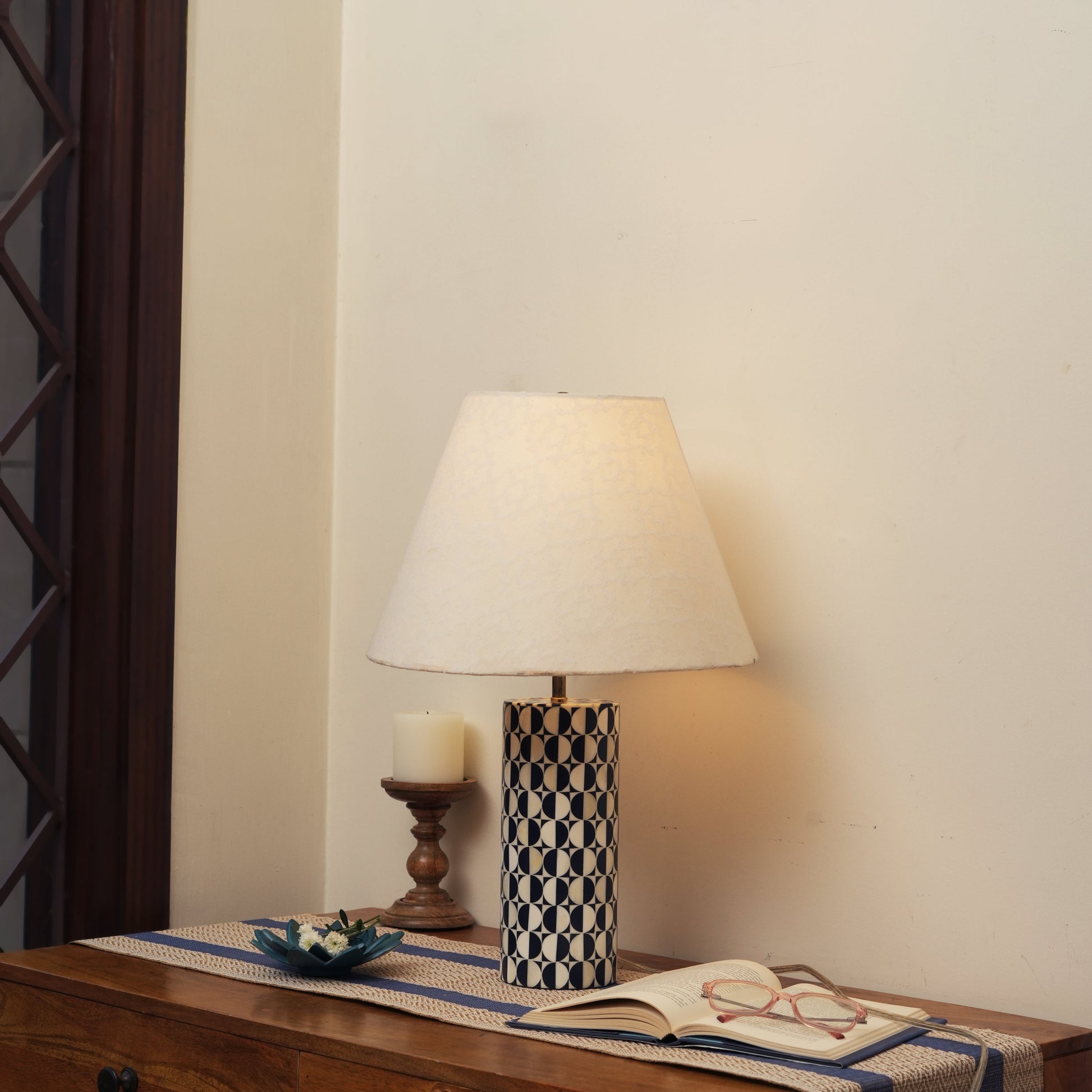 A bold classic reimagined, this handcrafted lamp base features a crisp blue-and-white geometric inlay on a sleek, compact silhouette. Made from resin and ethically sourced bone by skilled Indian artisans, it brings artisanal charm to bedside tables, shelves, or cozy nooks. Pair with a linen shade for a refined glow or gift it to a design lover with an eye for global craftsmanship.