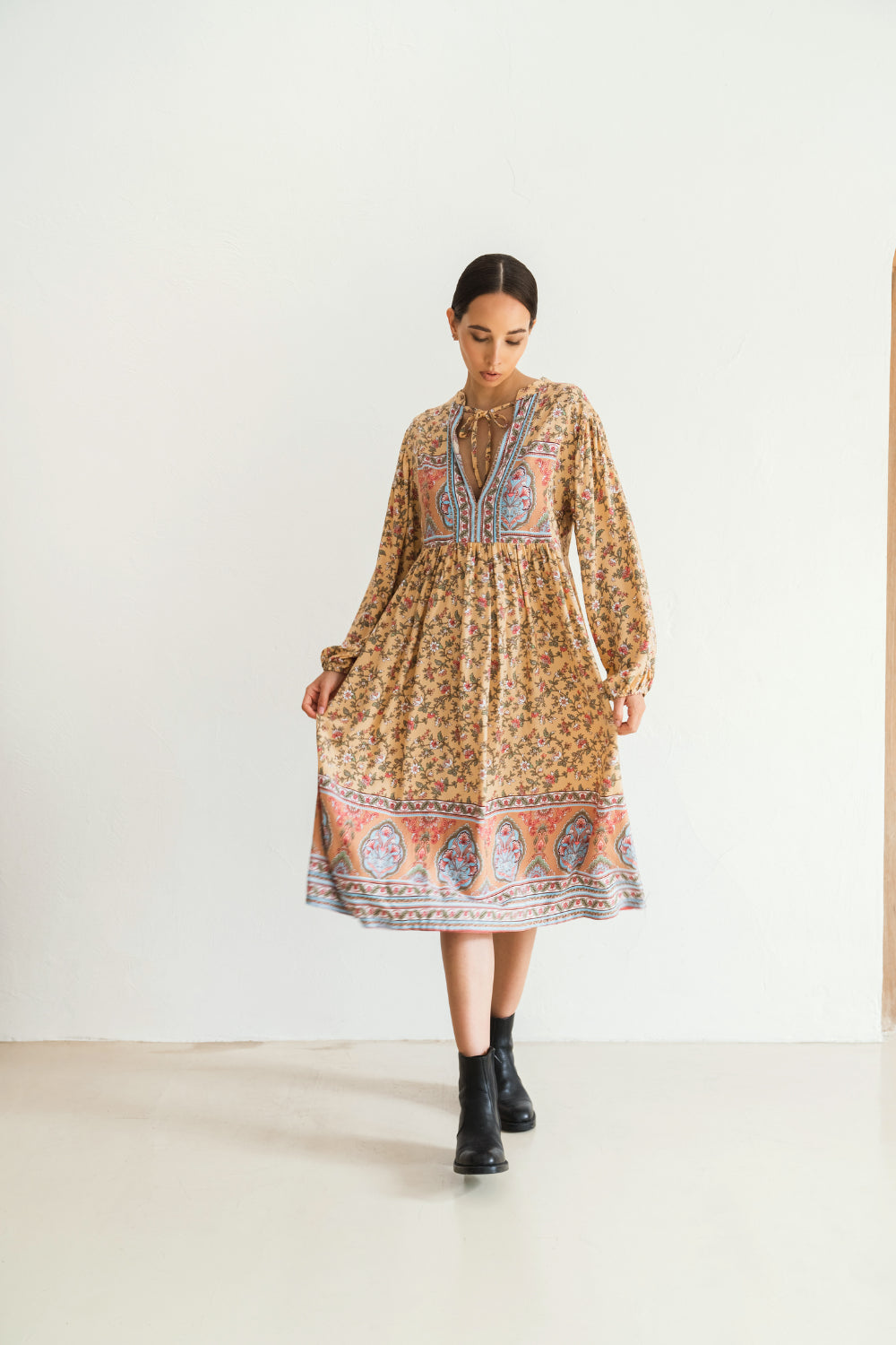Effortless and vibrant, the Gianna Midi Dress in Yellow is crafted from lightweight printed fabric with playful yellow and pink hues that evoke energy and youthfulness. Featuring long sleeves and a flowing midi silhouette, it’s perfect for transitional weather, weekend getaways, or sunny strolls in the park—combining comfort, versatility, and style in one easy piece.