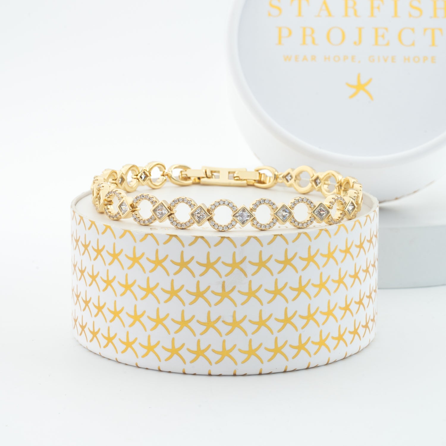 Radiate timeless elegance with the Gilded Halo Bracelet. Crafted in 18K plated gold, this stunning bracelet features shimmering zircon-encrusted halos of light, accented by brilliant luminious zircon stones in a regal diamond shape. This is the perfect meaninful gift for someone special, including yourself! Every purchase supports Starfish Project, helping women build bright, independent futures. Thank you for choosing jewelry with purpose. Box size and color may vary. Materials: 18k gold plated brass with zircon bracelet Hypoallergenic; lead and cadmium free with nickel content less than100ppm. Size: 19 inches
