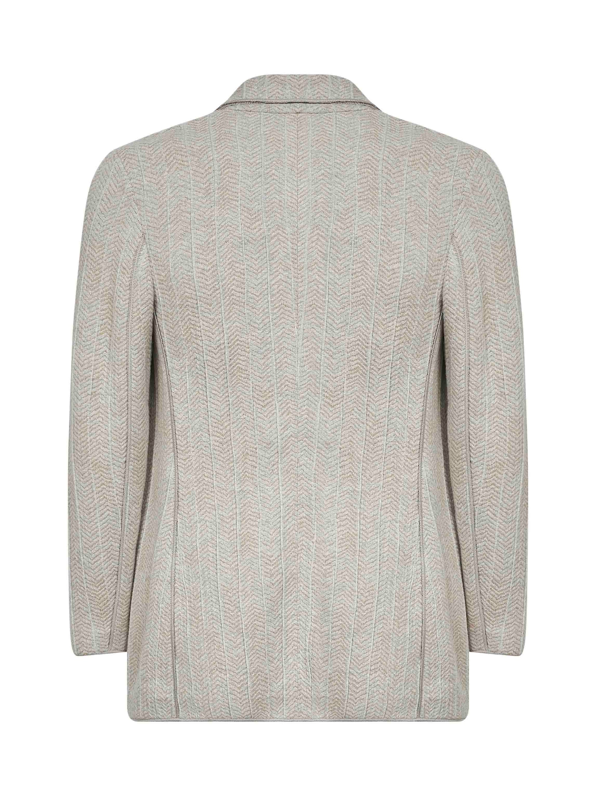 •Double-breasted four-button placket •Notch lapel •Long sleeves •Welt waist pockets •Rib detailing •Unlined •Two-tone cashmere and viscose jacquard jersey design with chevron motif •Length: 70 cm •Beige color •54% Cashmere, 40% Viscose, 6% Polyamide •Made in Italy