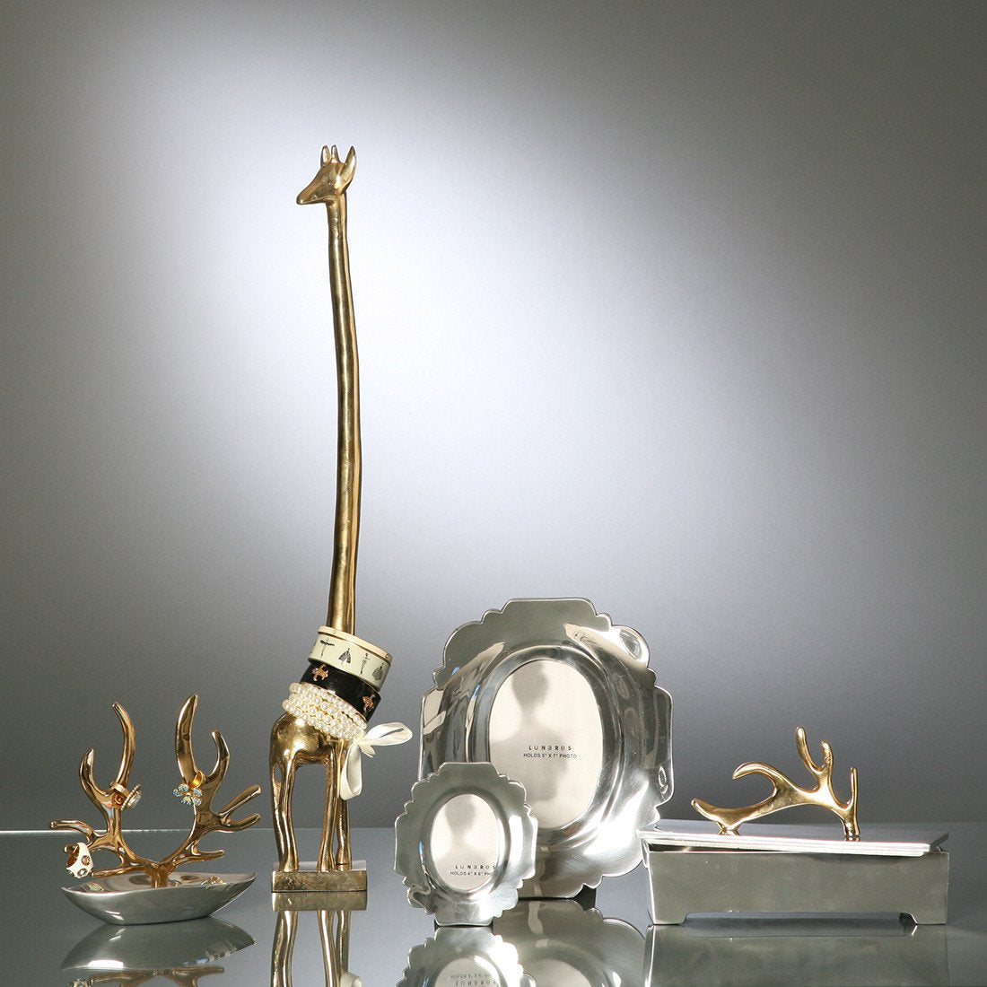 The MODERN FAUNA COLLECTION celebrates the most identifiable characteristics of each animal and exaggerates them. This sculptural collection has the signature rounded and decidedly modernist aesthetic for which Lunares is so well known. The elegant giraffe sculpture with its extra long neck is a whimsical addition to your bookshelves or create a surprising jewelry display by stacking your favorite bracelets on its neck Each of our creations is designed in our San Francisco studio. Master craftsmen using centuries old technique of sand casting create the original mould and skilled artisans hand create every piece, with pride, in our family owned factory. Details Dimensions : 25.5" H; 3.5" L; 2.25" W Finish : Gold Material : Aluminum Use and Care Given its handmade and hand-finished nature, variations in the piece are to be expected and celebrated. No two pieces are exactly alike. Hand wash with mild soap, water, and towel dry. Do not use abrasives or chemicals to clean the metal as it may scratch and discolor. Not dishwasher safe. Will not tarnish