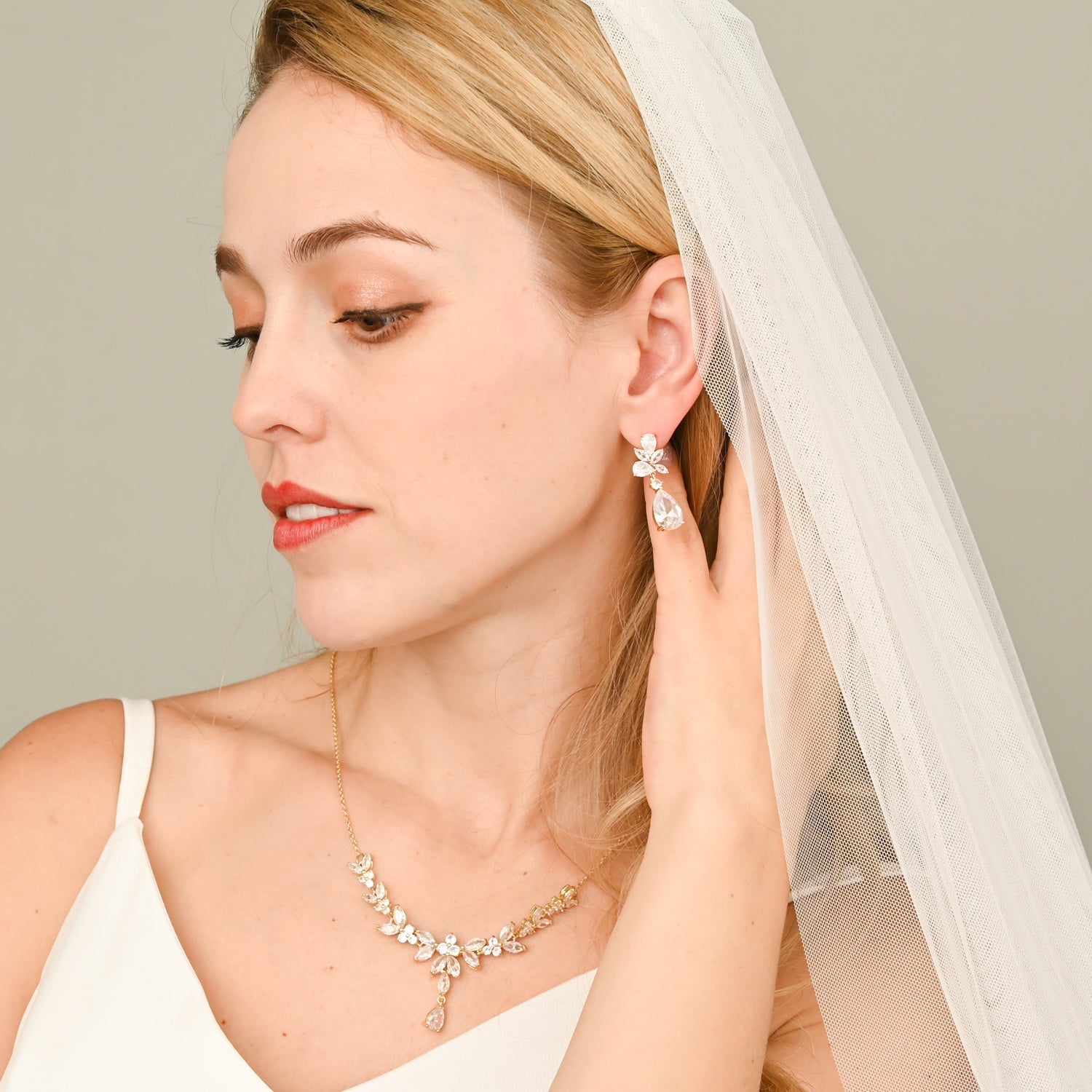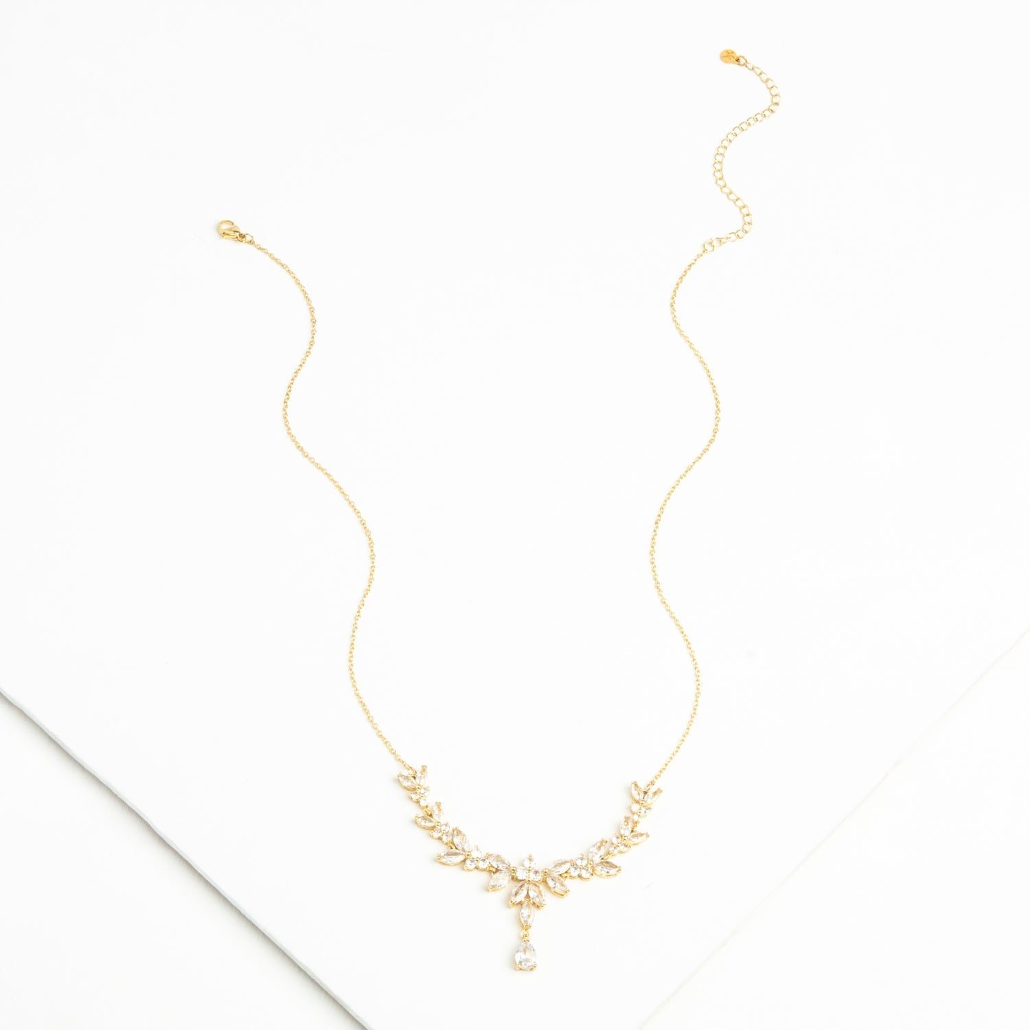 Timeless beauty meets glam in our Golden Chandelier Zircon Necklace– Featuring an intricate chandelier design adorned with shimmering zircon stones. The 14K plated gold adjustable necklace beautifully showcases the brilliance of each stone, creating a mesmerizing cascade of light and sparkle. Whether you're a bride walking down the aisle, a bridesmaid adding a touch of sophistication, or attending a special event, these earrings elevate your style and make a statement of refined elegance and style. The Golden Chandelier Necklace symbolizes the joy of celebration and the beauty found in every cherished moment. Let this gorgeous necklace serve as a reminder that life is meant to be adorned with moments of sparkle and grandeur. Your Impact: With your purchase, you directly contribute to our mission of providing holistic care, vocational training, and new opportunities for survivors. Together, let us illuminate the world with compassion, love, and a touch of everlasting beauty. Box size and color may vary. Materials: 14K Gold plated brass chain with zircons necklace Hypoallergenic; lead and cadmium free with nickel content less than 100 ppm. Size: 20-24 inches