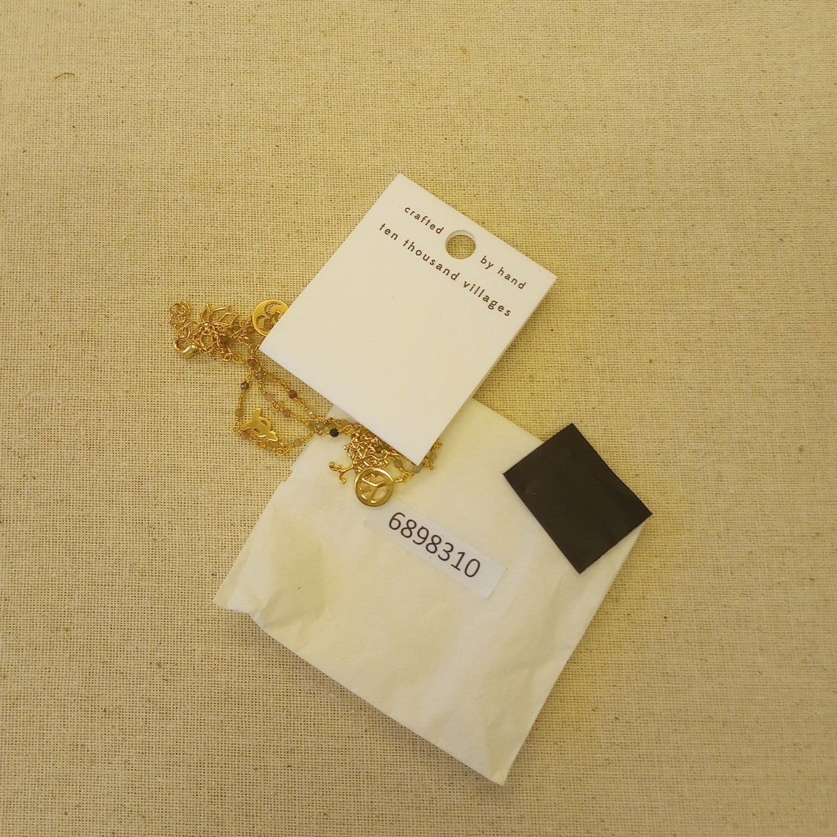 Embrace good fortune and positive energy with this amazing charm necklace! The delicate chain is adorned with tourmaline beads and features seven brass charms: Circle Mandala, Yoga Praying Figure, Ohm Symbol, Tree of Life, Lotus, Four Leaf Mandala, Peace Symbol. With adjustable links and a lobster claw closure, this necklace is easy to wear and the perfect way to put your good vibes on display! A Ten Thousand Villages Exclusive handcrafted in India.
