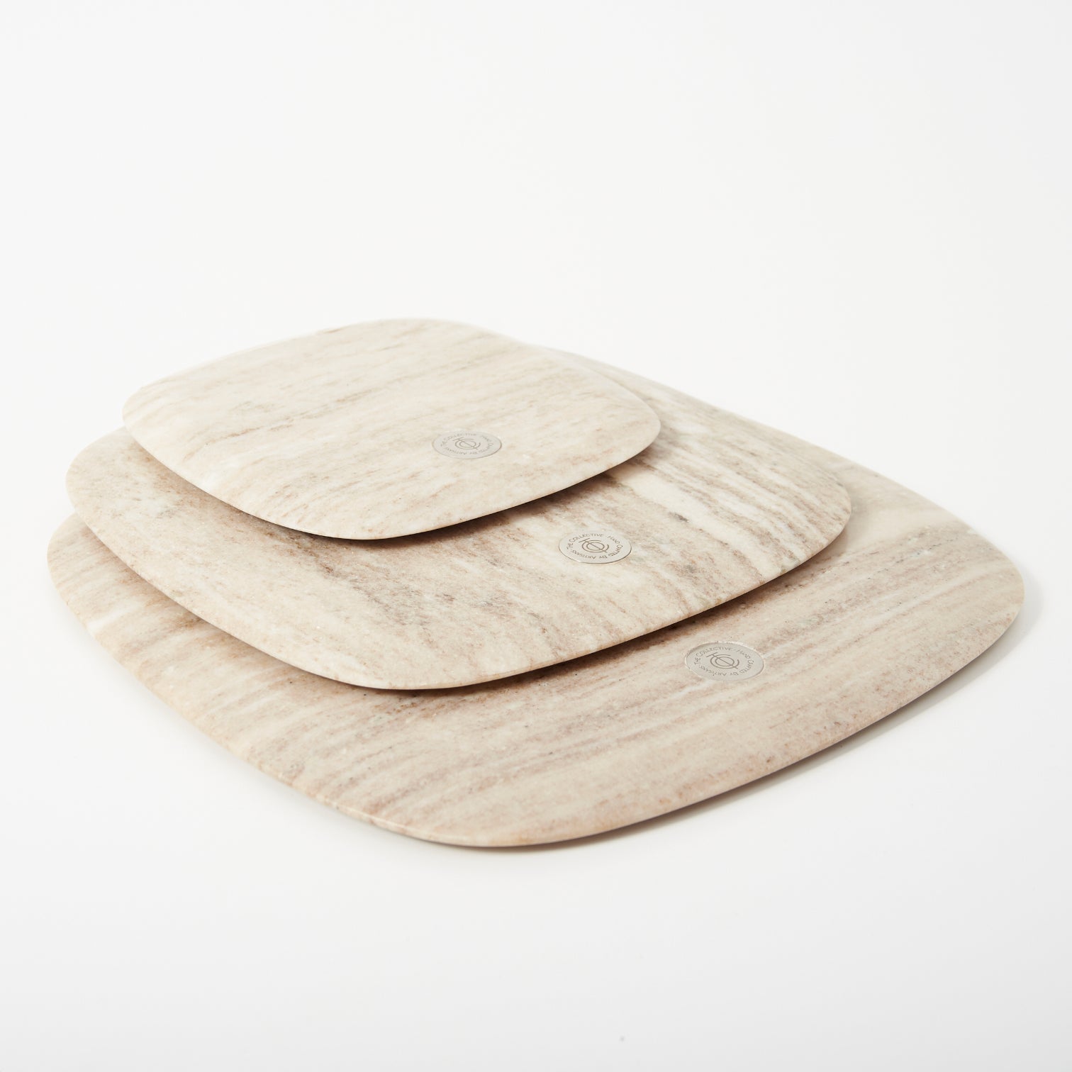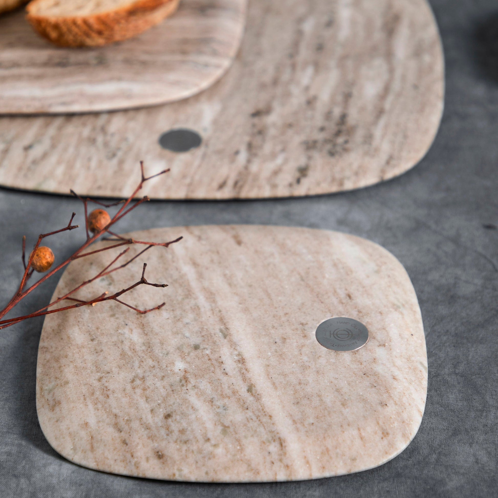 Crafted from striated grey marble with naturally unique veining, the Granada Square Boards feature wide beveled edges, rounded corners, and a polished stainless steel logo medallion. Available in two generous sizes, they offer a sturdy, elegant base for cheese, crackers, or hors d’oeuvres—perfect for stylish entertaining, solo or paired with other pieces in the collection.